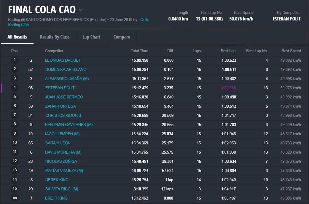 La piloto ecuatoriana Domenika Arellano fue dueña de la pole position, pero luego solo pudo ganar el tercer heat clasificatoria. Las dos primeras carreras parciales quedaron para Leonidas Drouet, ecuatoriano quien fue convirtiéndose en un piloto fuerte y también se quedó con la pre final y la “Súper Final” que coronó al campeón 2019.
