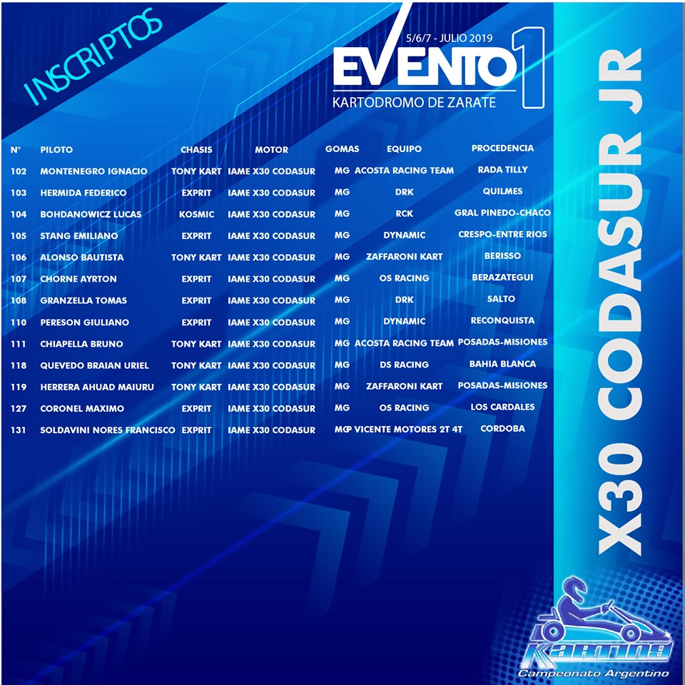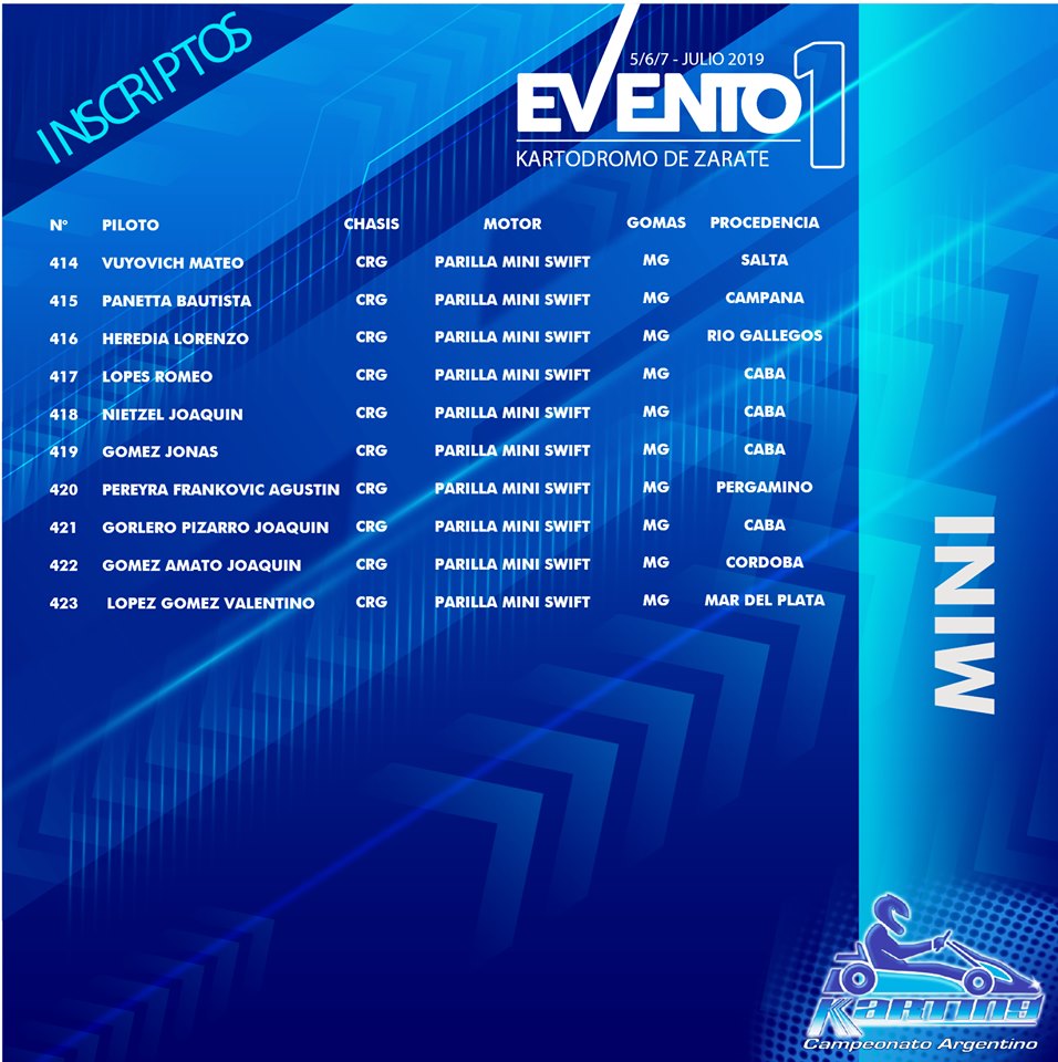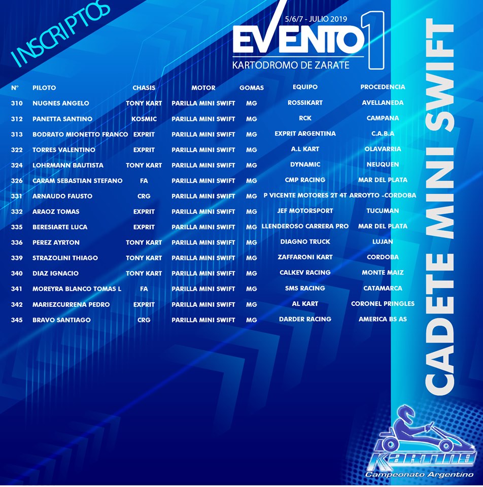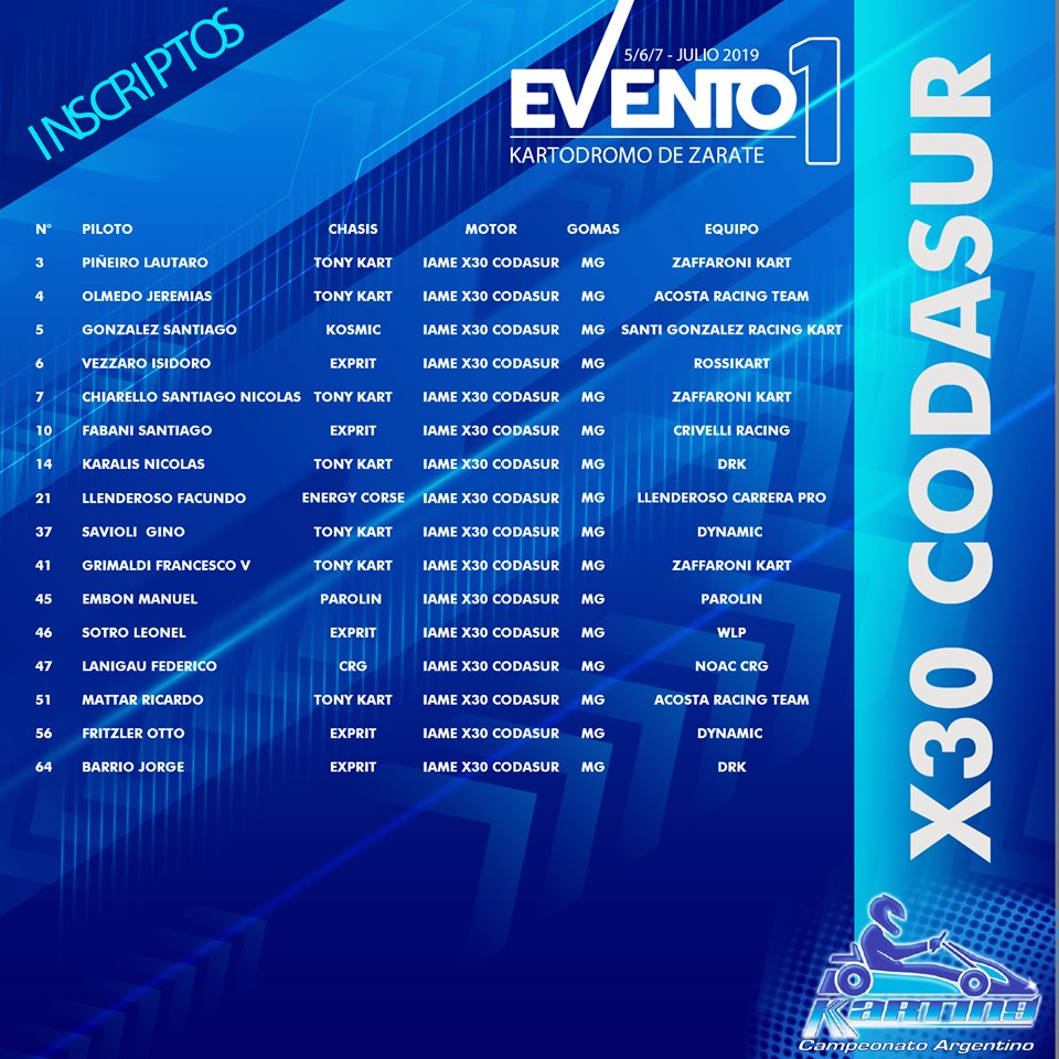 Se conoció la lista de inscriptos para el Evento 1 del Campeonato Argentino de Karting, que se llevará a cabo desde este viernes 5 de julio hasta el domingo 7 en el circuito de Zárate, Buenos Aires
