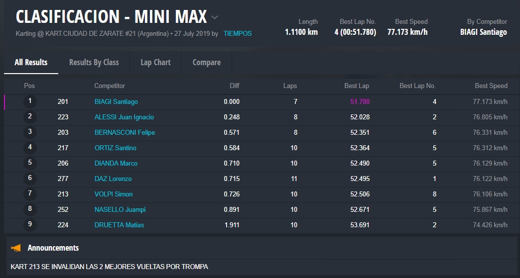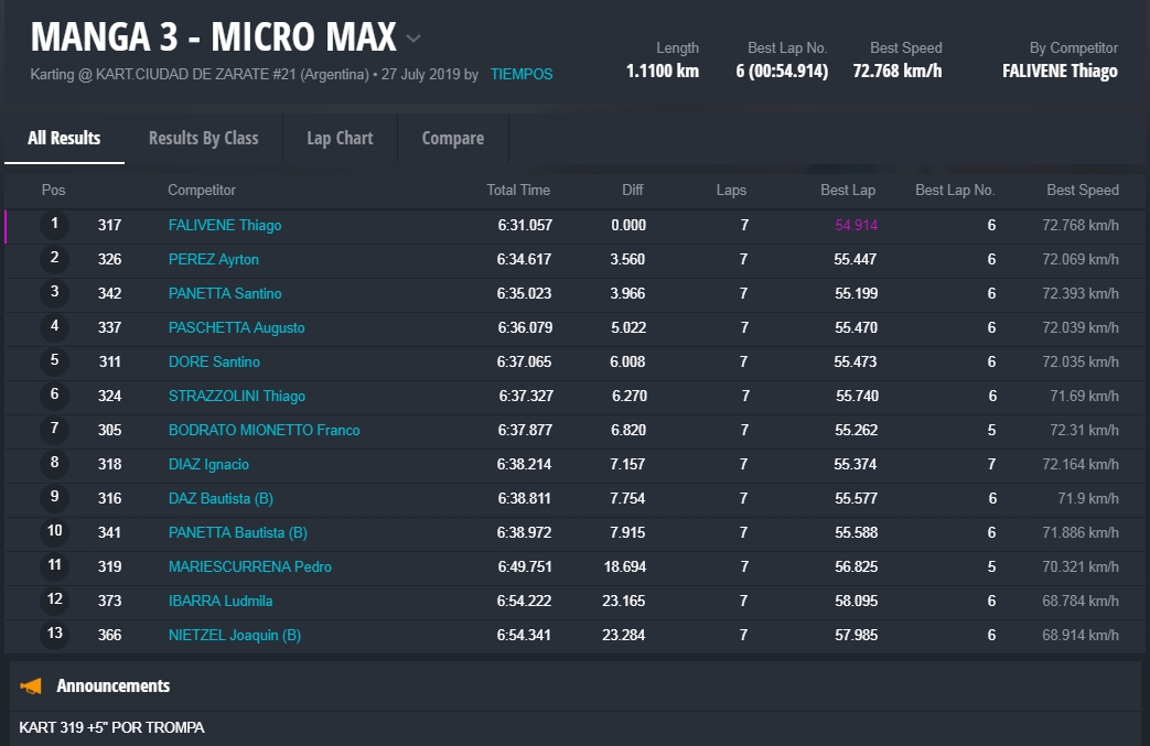 La referencia del fin de semana fue Thiago Falivene, piloto que se llevó la pole position y ganó en pista todas las carreras, pero en la primera manga y en la carrera final fue sancionado por trompa, heredando ambas victorias Santino Panetta (RCK Kosmic).