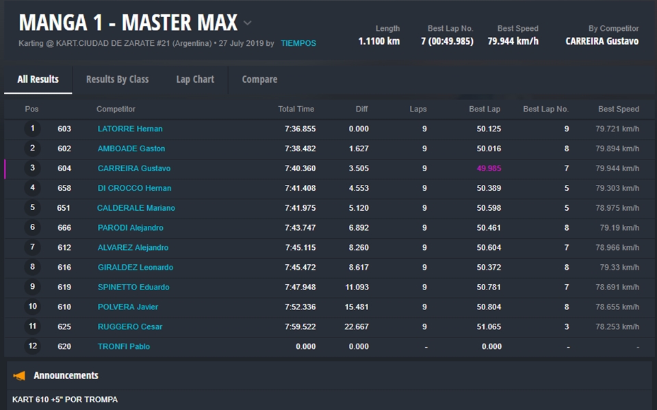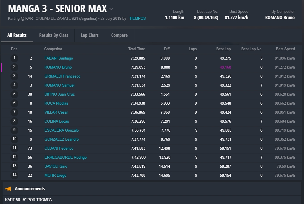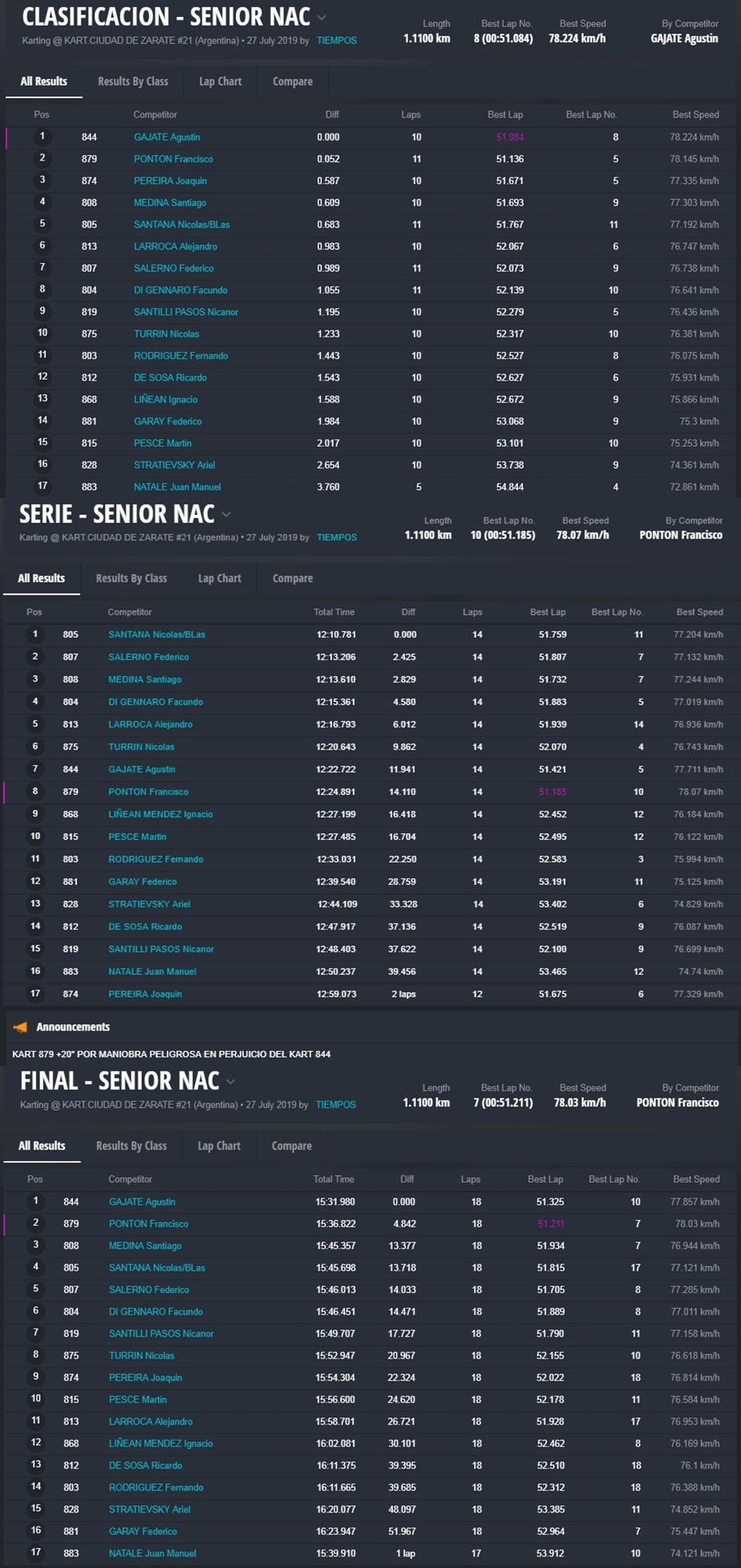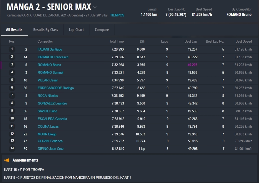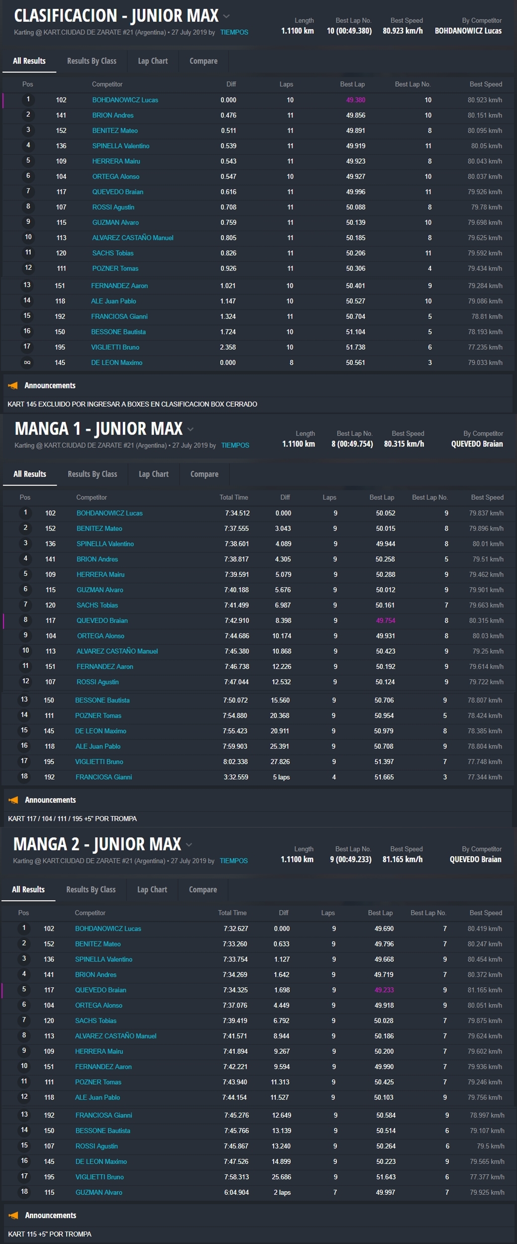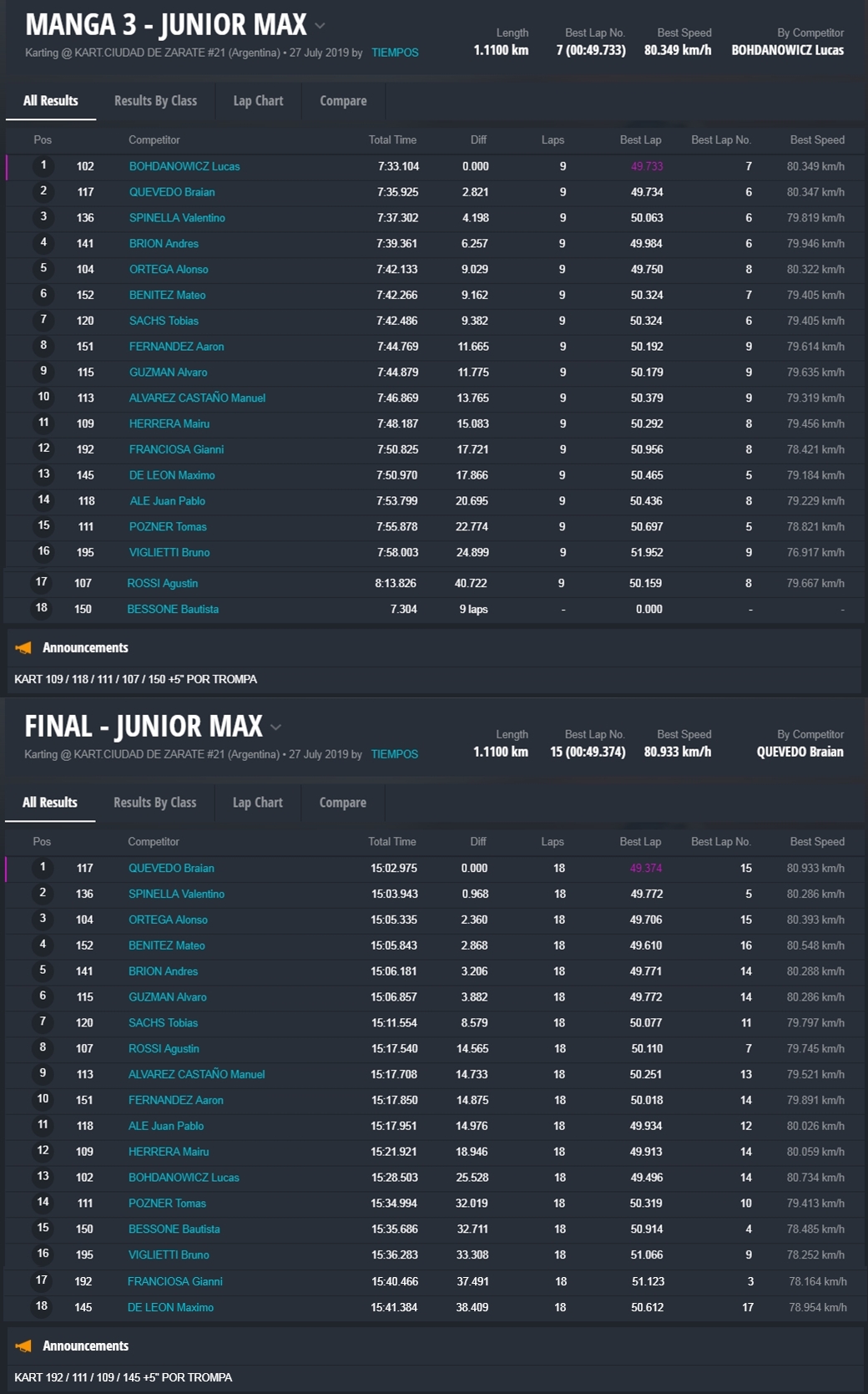 Braian Quevedo (Junior Max) se quedó con un triunfo polémico, porque faltando dos curvas un hubo un toque y la carrera se definió sobre el cierre de la jornada a favor del bahiense. En Senior Max el misionero “Chicho” Grimaldi consiguió una victoria importantísima, porque logró descontar puntos a Fabani, quien abandonó luego de ir ganando y ser el actual líder.