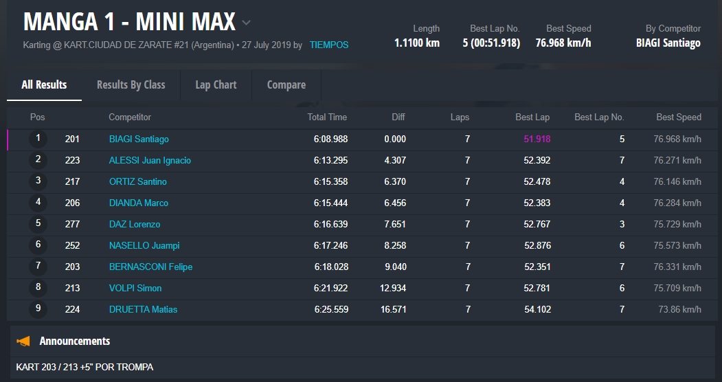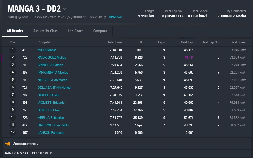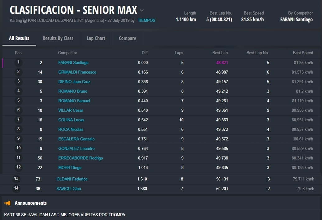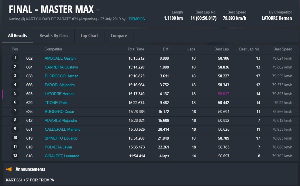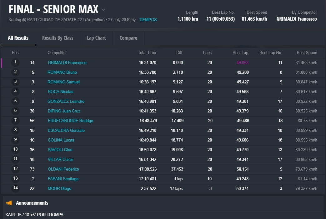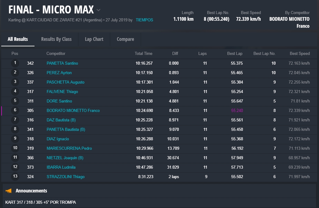 La final precisamente fue una de las mejores del año, con una lucha titánica entre los cuatro pilotos, con cambios en la punta entre Panetta, Pérez y Falivene. Este último fue quien festejó en pista e incluso dio la vuelta de honor con la bandera, pero al llegar a parque cerrado constató que tenía metida la trompa y el triunfo quedó para Santino Panetta, piloto de la ciudad de Campana (Buenos Aires).