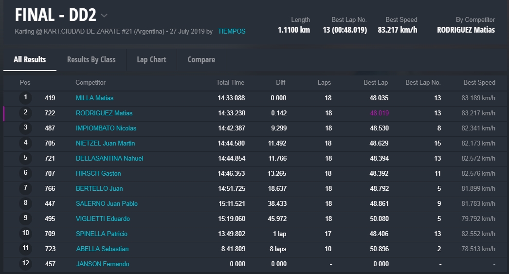 Gastón Amboade hizo muy bien las cosas y sumó fuerte para mantenerse al frente del torneo, siempre con el objetivo de viajar a Italia. En DD2 se vivió un mano a mano fantástico entre Matías Rodríguez (DD2 Master) y Matías Milla (DD2 Senior), pilotos que tiene prácticamente asegurada su participación en la Grand Finals tras sus nuevos triunfos.