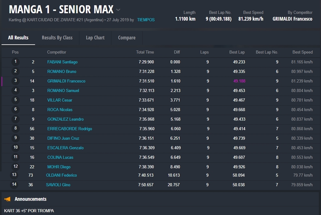 Muy festejada fue la victoria lograda por Francesco Grimaldi. El piloto de Misiones que es parte del team Zaffaroni Kart consiguió imponerse en la carrera final y acortar varios puntos al líder del campeonato Santiago Fabani, que abandonó la carrera cuando iba ganando.