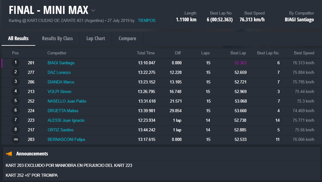 En la maniobra, Braian se montó sobre el kart de Lucas. Quevedo pudo salir adelante, pero el kart de Bohdanowicz salió despedido para la izquierda y abandonó. Luego de analizar varios videos, el comisario deportivo decretó la victoria de Quevedo.