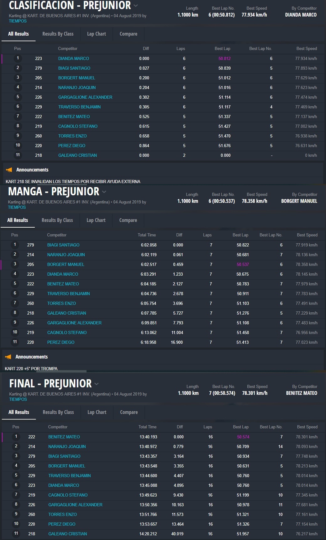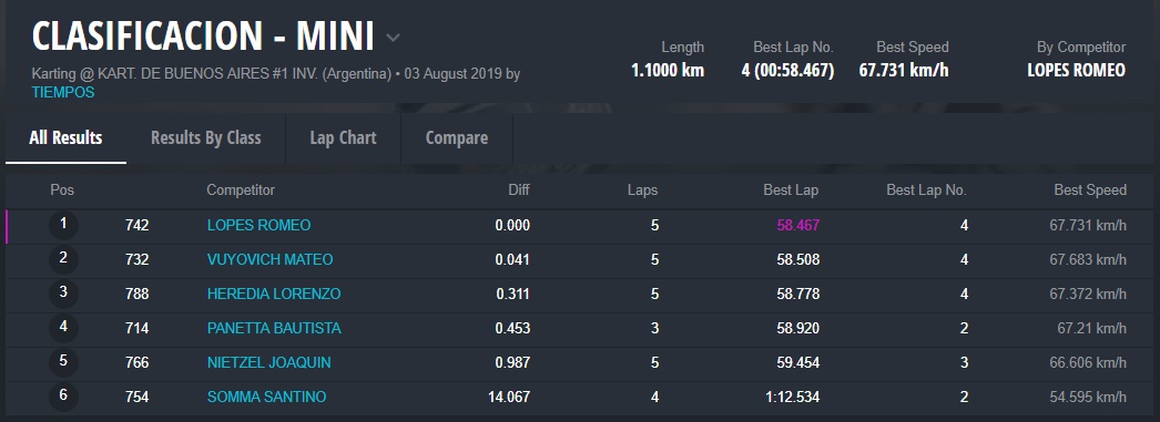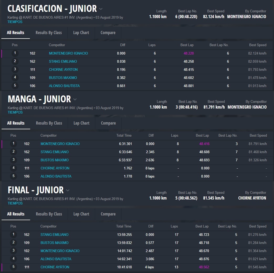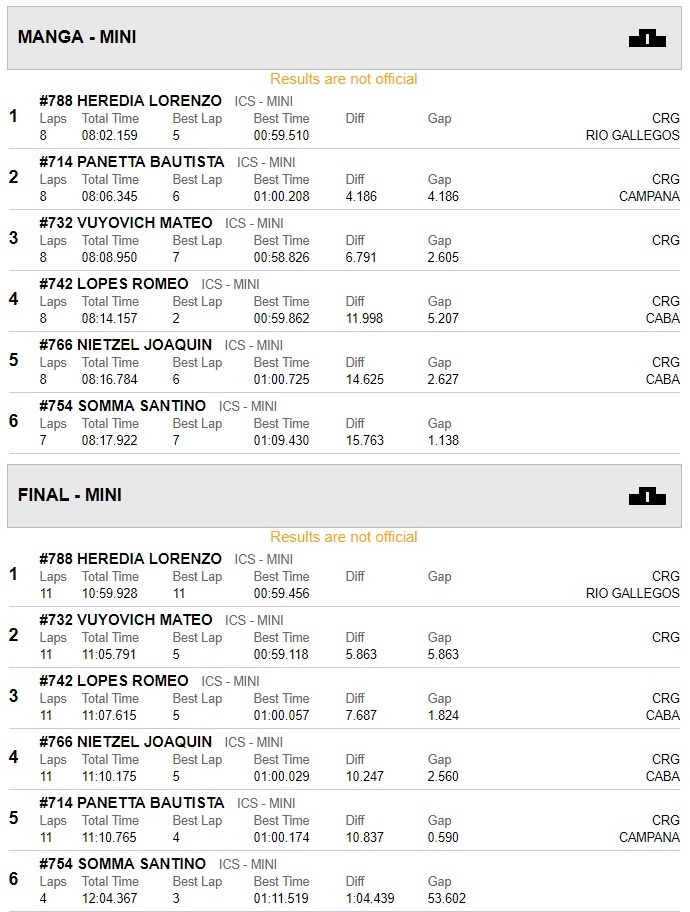 Cayó la bandera a cuadros y Chorne fue el único que festejó su buen triunfo. Lo siguió Stang, el cordobés Maxi Bustos (equipo DRK Racing) y Stang. Cuarto llegó Montenegro y quinto Bautista Alonso, del team Zaffaroni Kart.