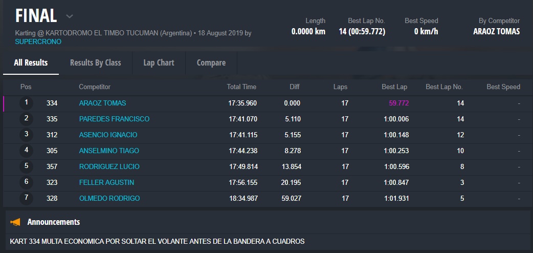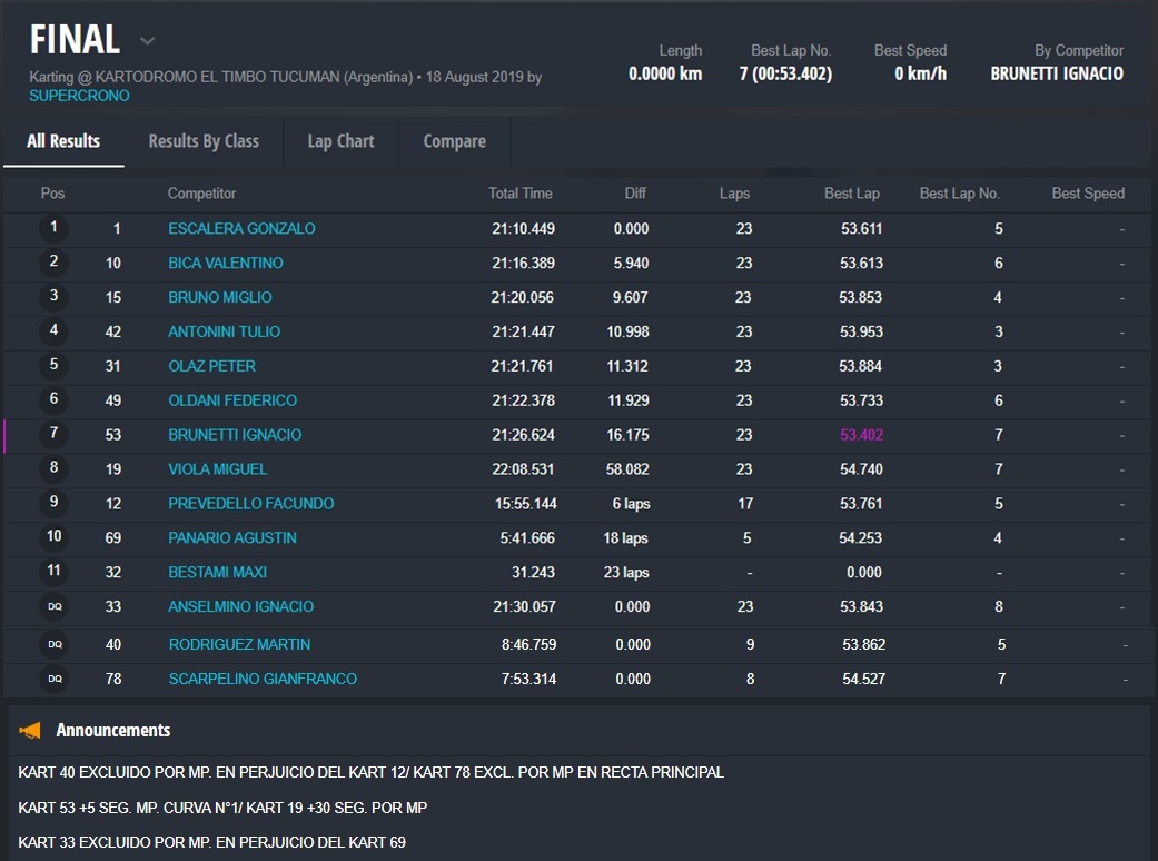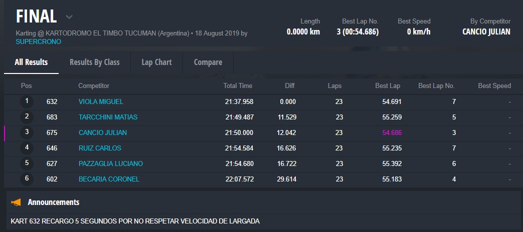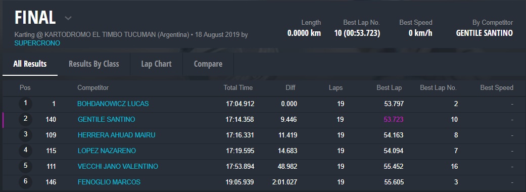Cerrando el resumen, en la categoría de los mayores, otro Santiagueño se quedaba con la pole, Juan Beccaria pero aquí también aparecería la gran actuación del Tucumano Viola que desde el fondo se llevaba la prefinal y con gran dominio en la final se alzaba con la victoria luego de ser recargado con más 5 por no respetar la velocidad de largada. Así y todo se las ingenio para sacar la distancia necesaria dejando 2do a Matias Tarcchini y 3ro, Julian Cancio.