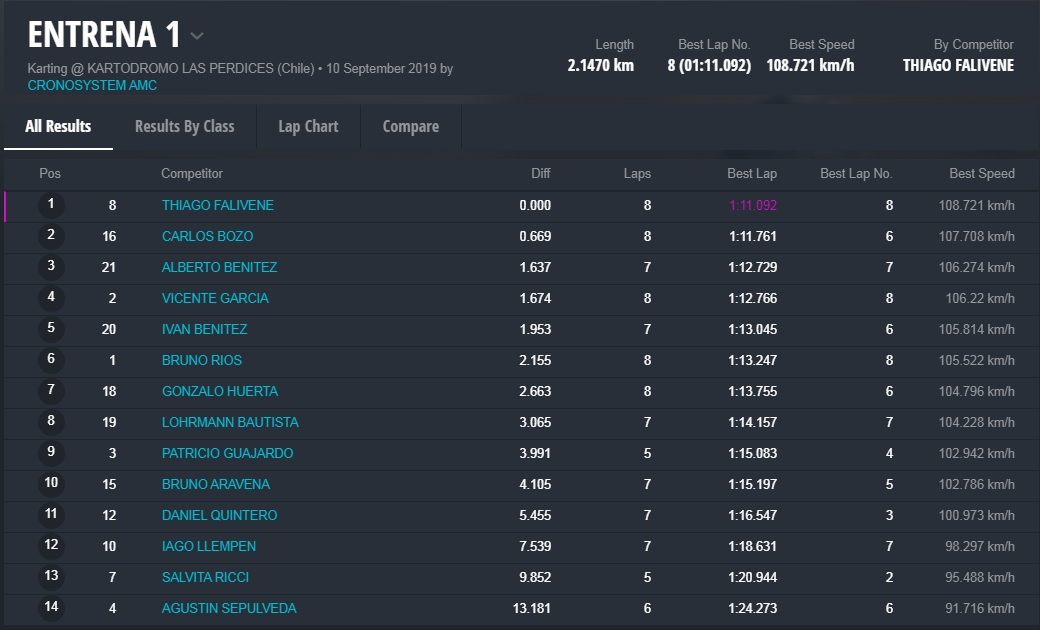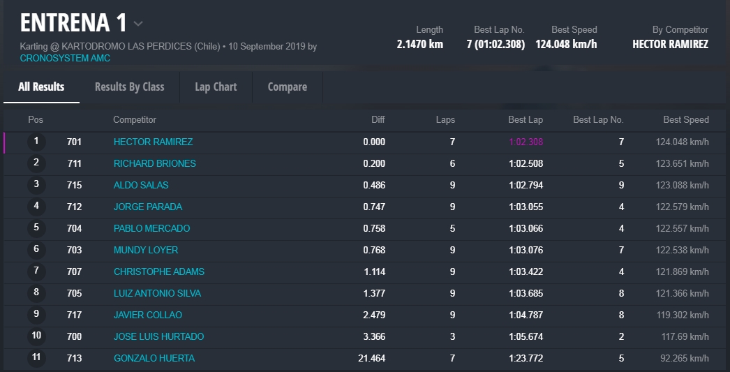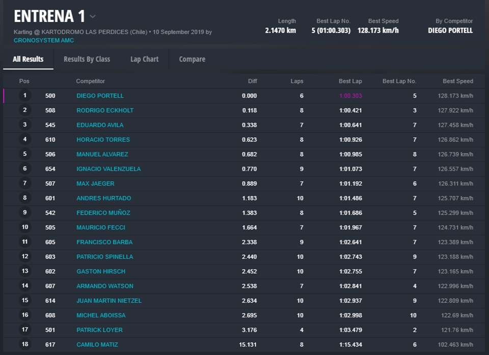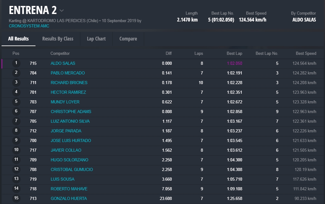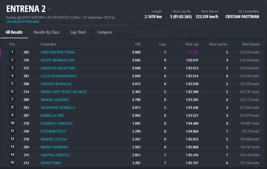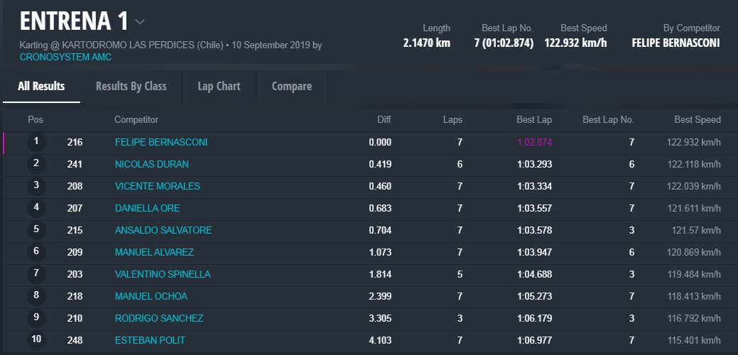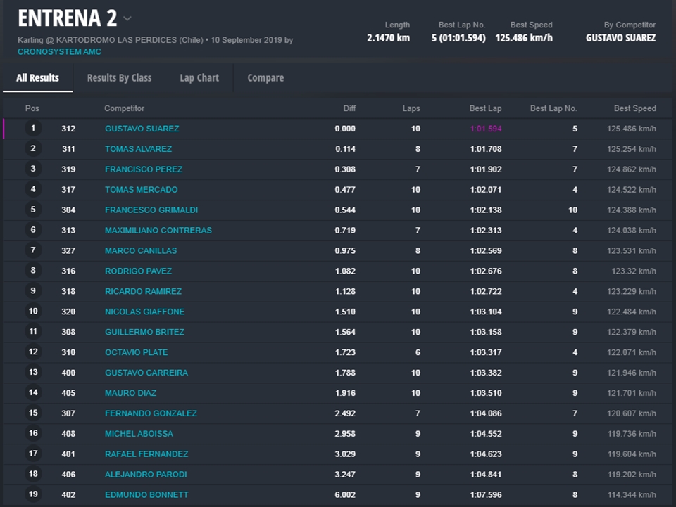 La segunda tanda fue para “Tuti” Súarez, flamante campeón Senior de Rotax Chile. Lo siguieron Alvarez y Francisco Pérez, todos de Chile.