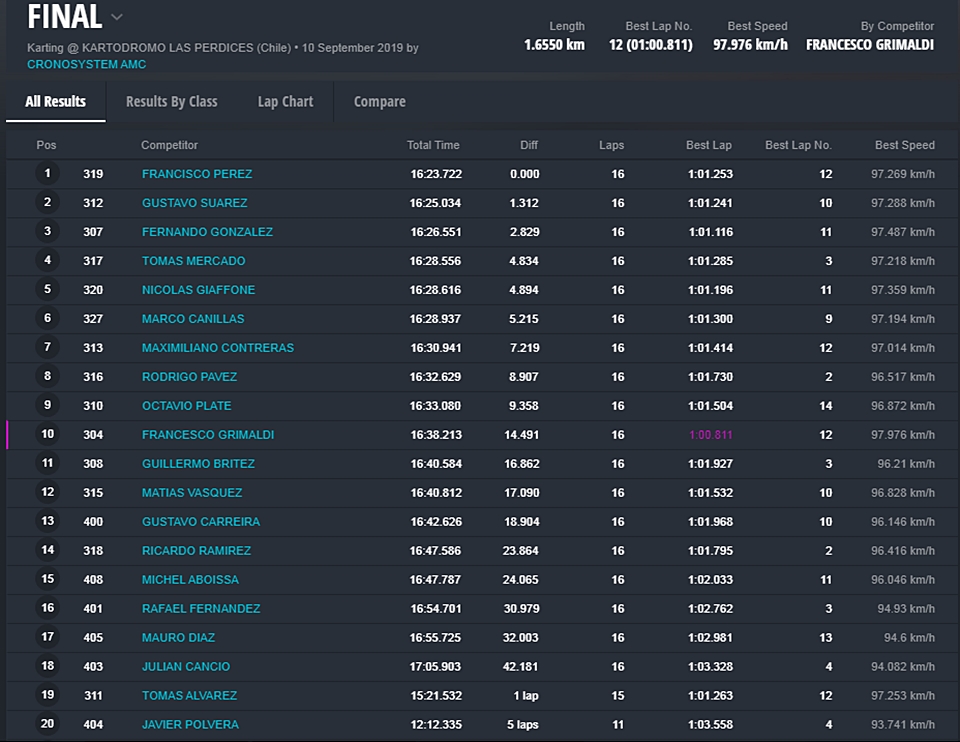 El chileno Francisco Perez se quedó con el título Senior Max de local, frente a su público y con atención en pista del equipo Zaffaroni Kart. Pérez terminó segundo en pista, pero accedió al primer lugar luego de confirmar de que Nicolás Giaffone (Brasil) tenía la trompa caída y recibía su correspondiente recargo.