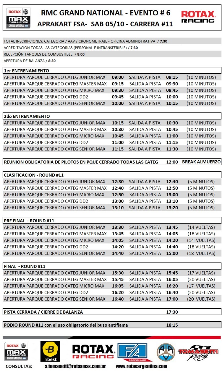 El día Viernes habrá pruebas libres. El día Sábado ya comenzarán los entrenamientos desde las 09 de la mañana luego las clasificaciones, pre finales y finales mismas que pertenecen al Round #11 del campeonato.
