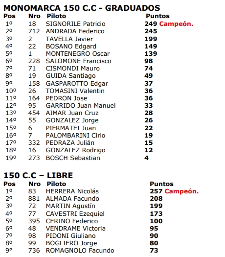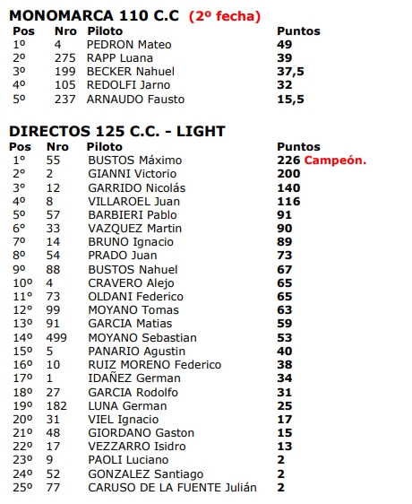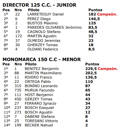 La carrera fue en el circuito de Colonia Caroya y así quedaron las tablas según los datos brindados por la Frad Córdoba.