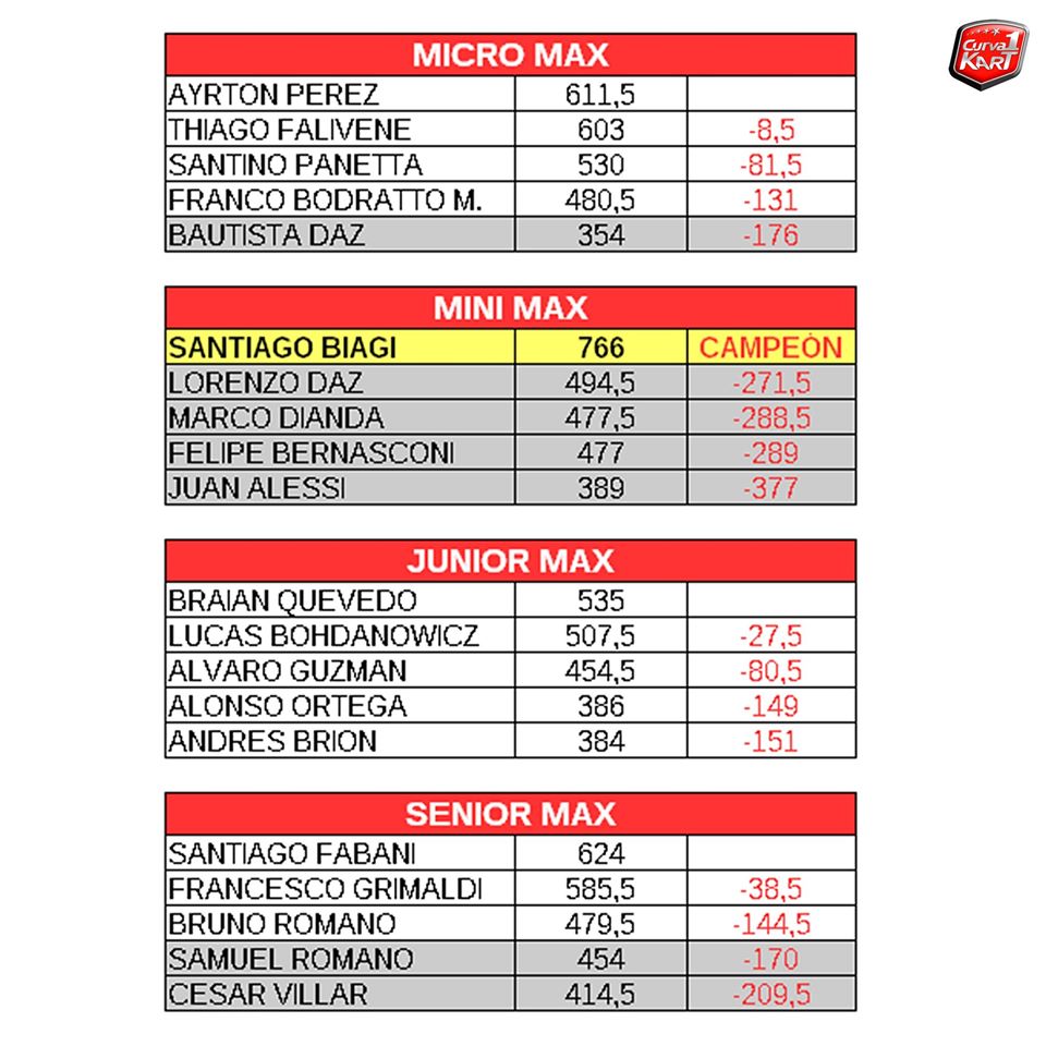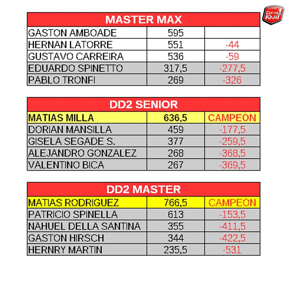 Te mostramos los pilotos que llegan con chances matemáticas de ser campeón, los que no y los consagrados: Santiago Biagi (Mini Max), Matías Millas (DD2 Senior) y Matías Rodríguez (DD2 Master).