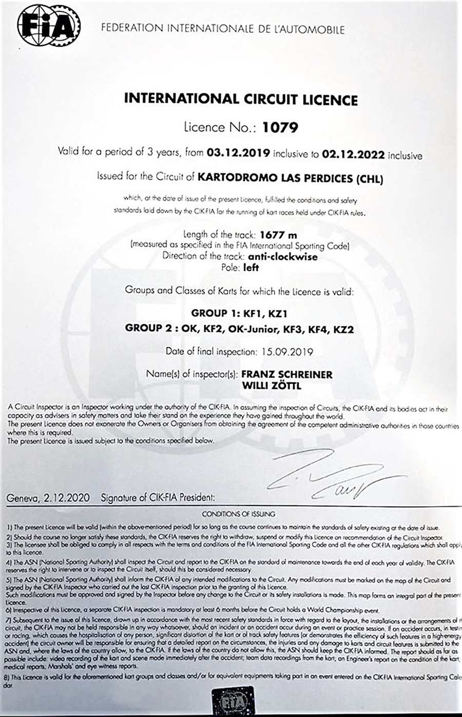 Con fecha 3 de diciembre de 2019 y hasta el 02 de diciembre 2022, el Kartodromo Las Perdices, Maria Pinto (Chile) ha sido homologado por Comisión Internacional de Karting (CIK-FIA).
