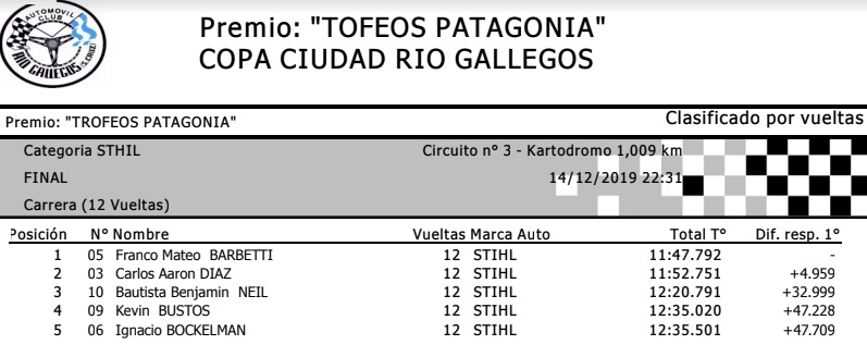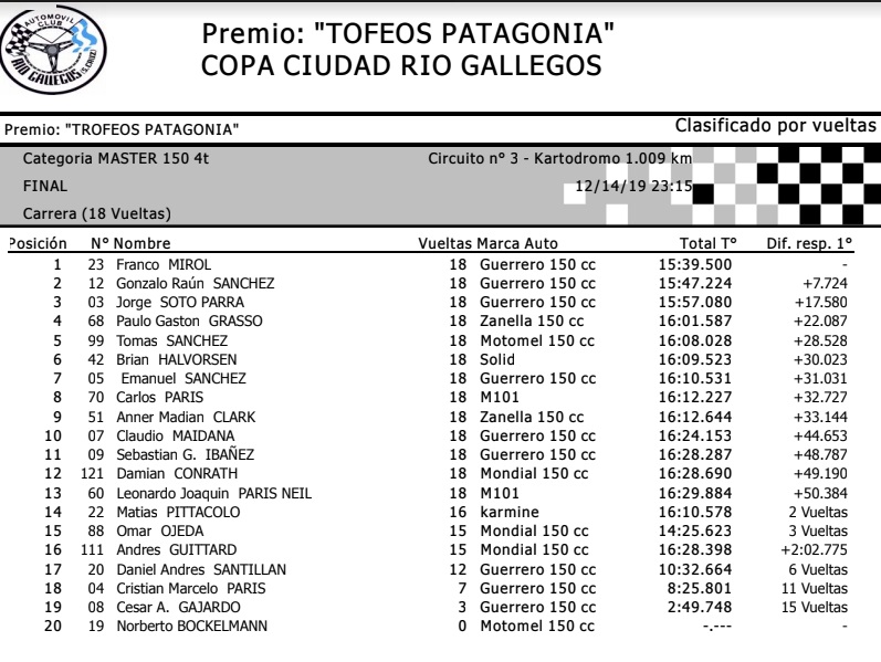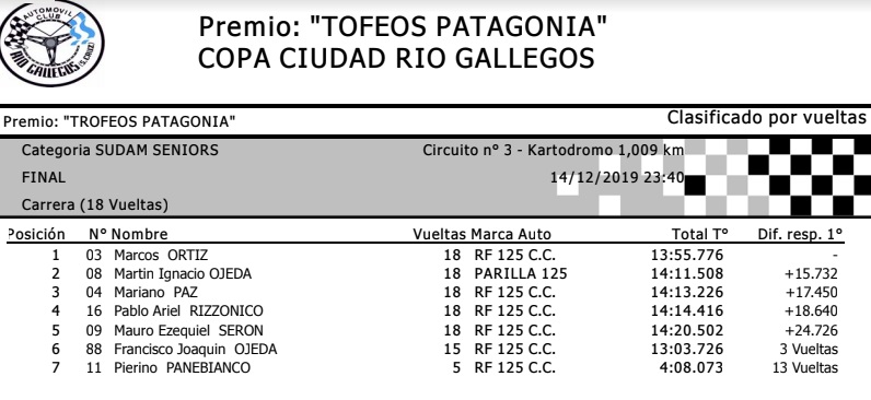 Mirá los tiempos de clasificaciones generales, series y finales de la competencia de Karting, realizada el sábado 14 en el Kartodromo Islas Malvinas Argentinas, correspondiente a la 7° y última fecha del calendario anual 2019 del Premio “Trofeos Patagonia” Copa Ciudad De Río Gallegos en las categorías Sthill, Sudam Seniors y Master 150 4T.