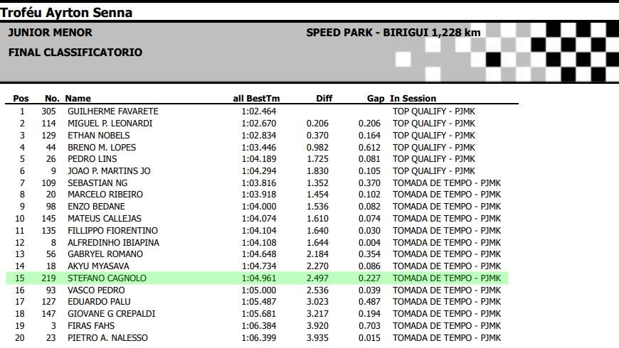 STEFANO CAGNOLO disputó hoy la clasificación oficial (tomada de tiempo en Brasil) de la categoría Junior Menor, donde tenía todo para hacer un buen tiempo, pero con la lluvia los registros fueron atípicos y hubo mucha diferencia entre cada piloto. El cordobés de Mendiolaza quedó 15º en la qualy y mañana enfrentará las mangas a bordo de su chasis Thunder, con atención en pista de Calkev Racing de Argentina.