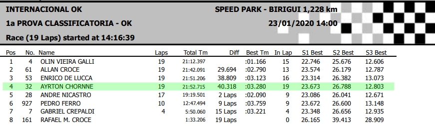 El kartista de Berazategui AYRTON CHORNE cumplió con un buen papel, en una divisional que compite por primera vez y con nombre importantes, con trayectoria, a pesar de que solo hay 8 karts. Chorne clasificó 3º y luego fue 4º en la única manga disputada. Mañana tendrá la segunda “Prova Classificatoria” o manga.