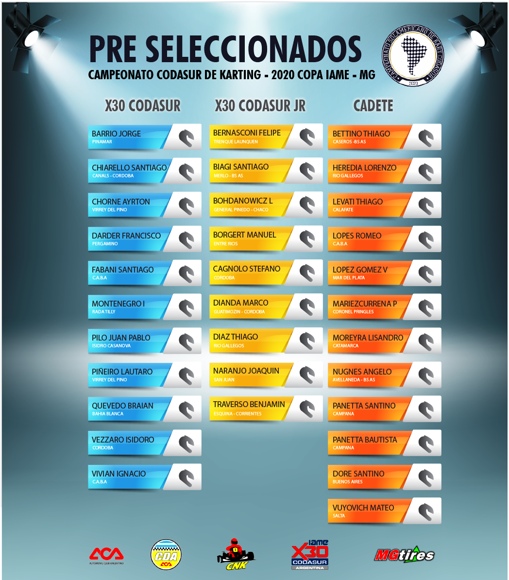 La Comisión Nacional de Karting del ACA difundió la lista de pilotos argentinos “pre seleccionados” para participar de la 3° edición del “Campeonato Codasur de Karting 2020 – Copa IAME – MG”.