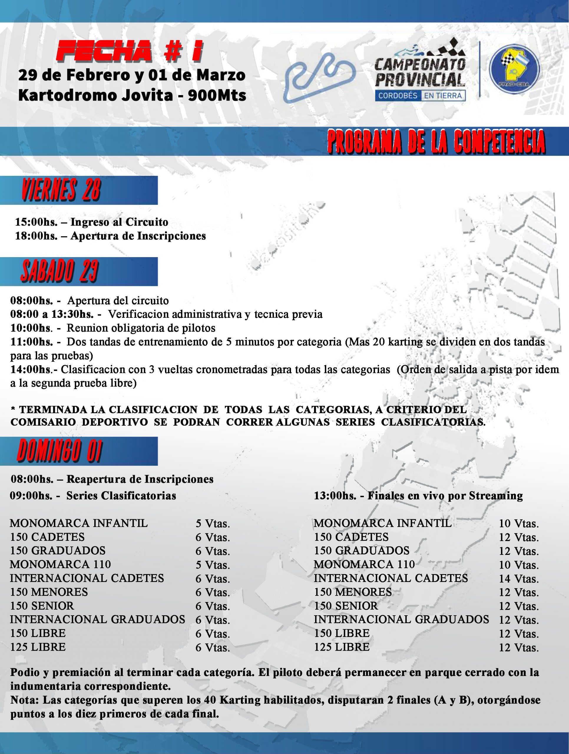 Desde este viernes 28 de Febrero, comienzan las actividades de la primera competencia anual del Campeonato Provincial Cordobés de Karting en Tierra a disputarse en el Kartodromo de la localidad de Jovita. La actividad oficial iniciara este sábado 29 con entrenamientos y clasificaciones, mientras que el domingo 01 de marzo se disputarán series y finales con transmisión en vivo y en directo vía streaming.