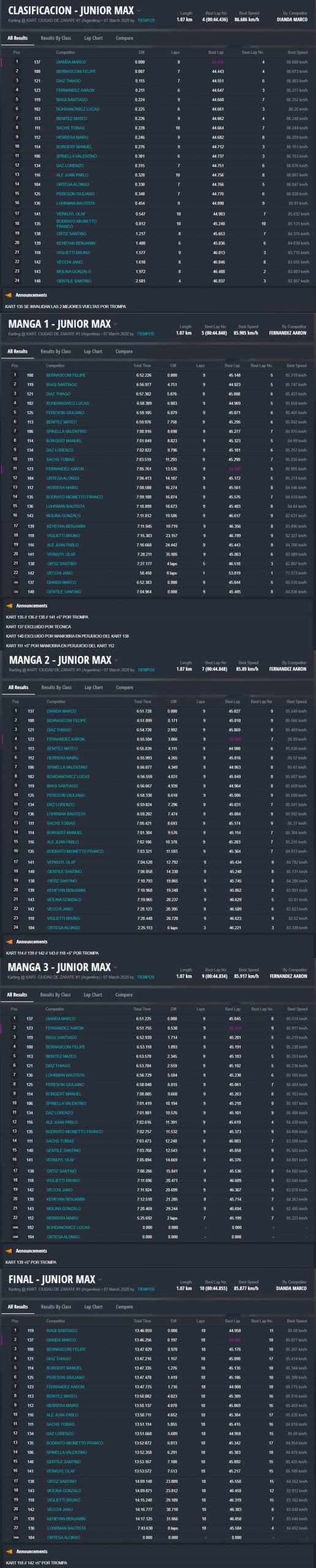 La categoría más numerosa fue la Junior Max, donde hubo 24 pilotos y 18 estuvieron dentro del segundo clasificatorio, con 15 karts ubicados en menos 3 décimas y media. La final fue excelente, con numerosos cambios en la punta.