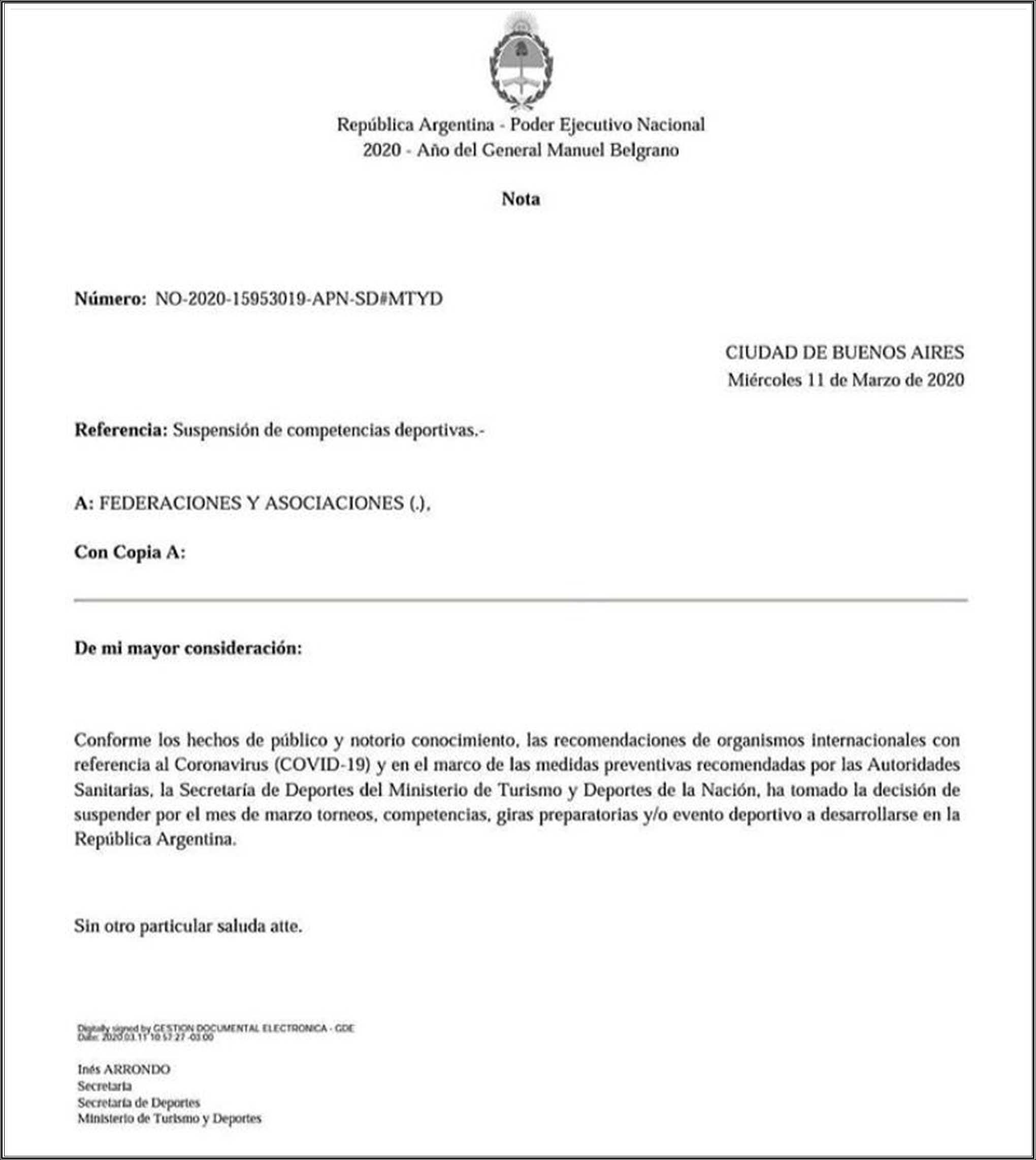 En la mañana del miércoles comenzó a circular por redes sociales esta nota donde indica que a raís del #Coronavirus se suspenderían en todo el país y durante MARZO todas las competencias deportivas.