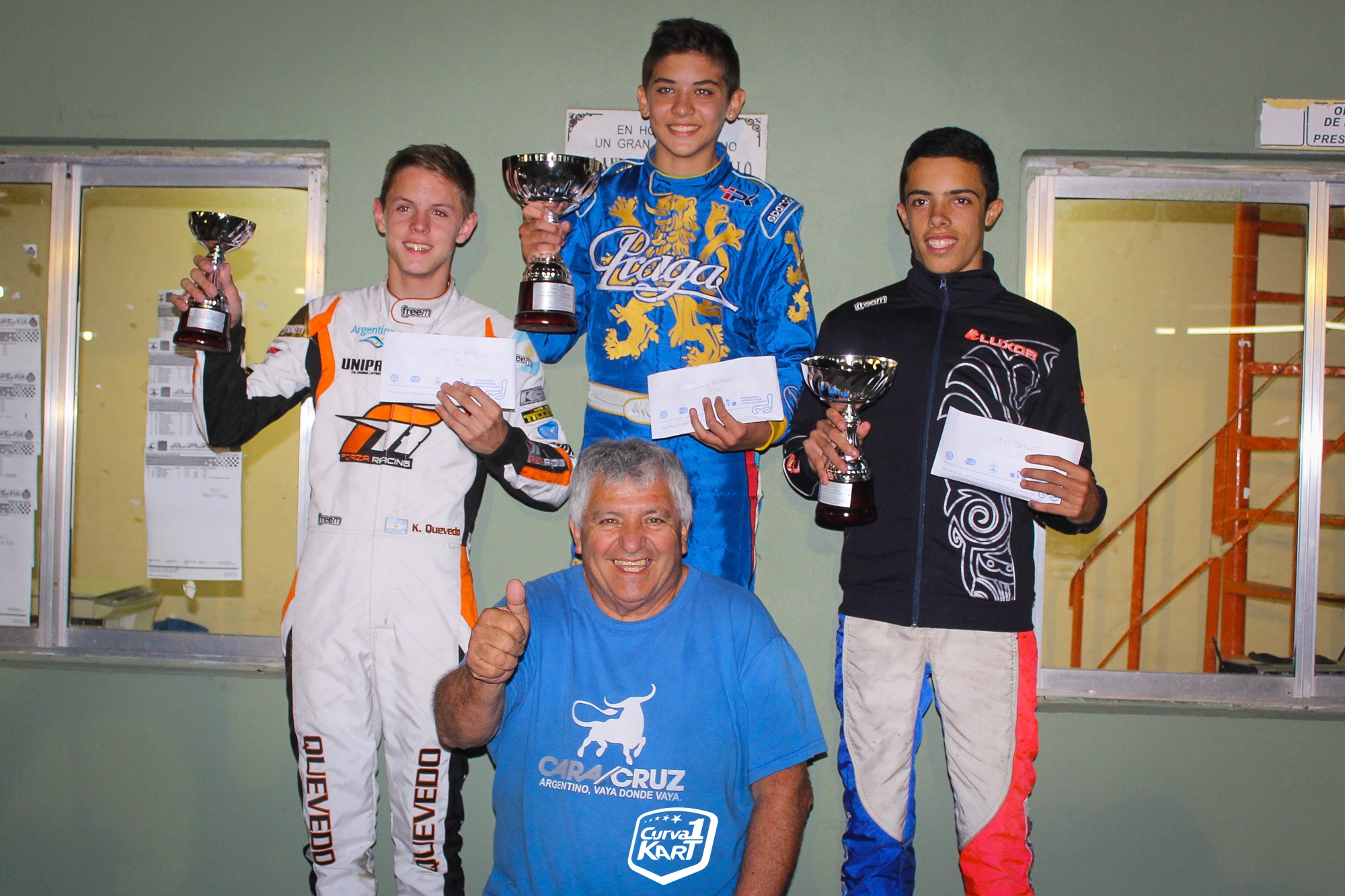 FOTO 10. Podio Senior con el ganador Lucas Carabajal, el escolta Kevin Quevedo y tercero Ramiro De Bonis. Acompaña, el organizador del evento y dueño del Kartódromo de Zárate, Juan Tardito.