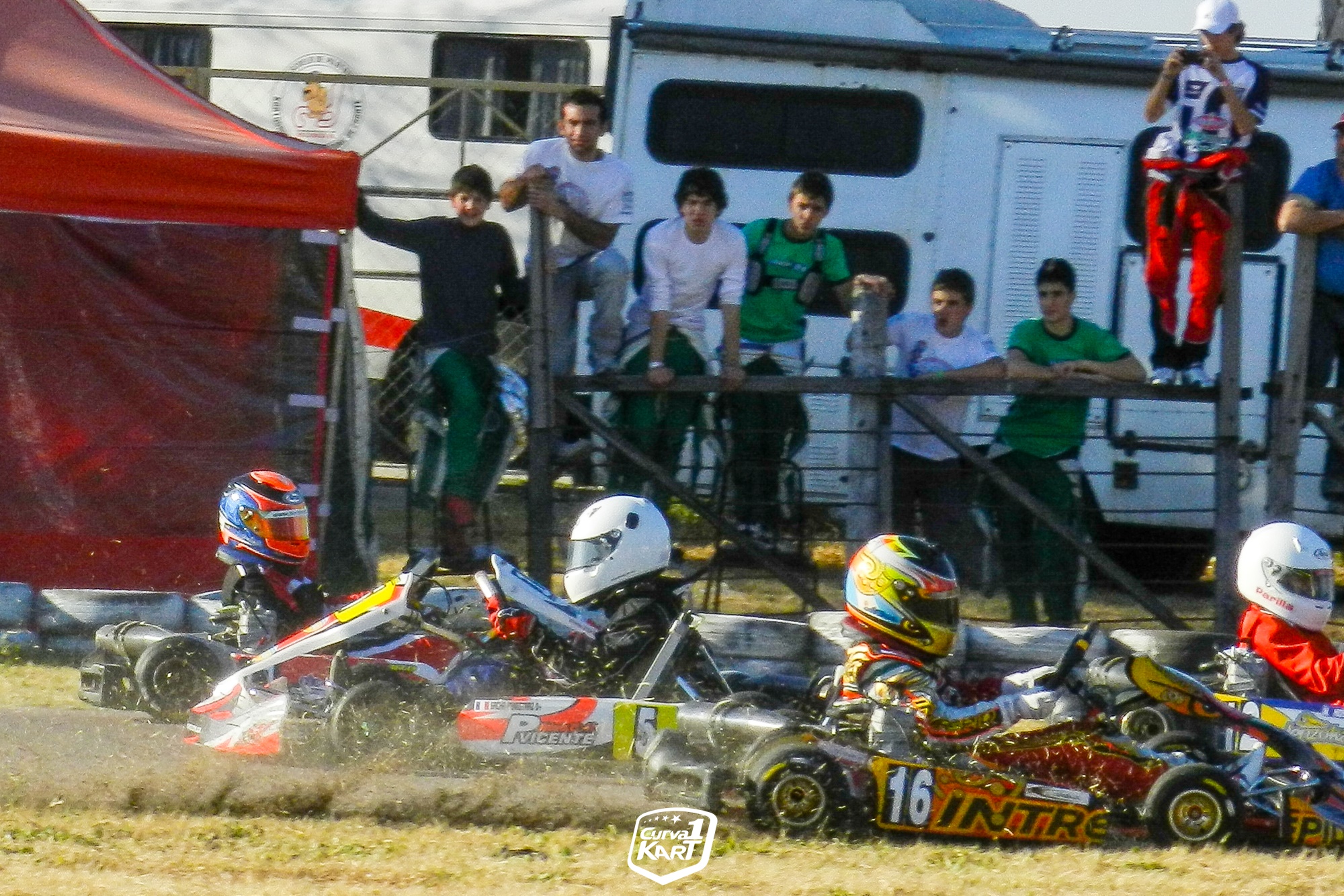 FOTO 3. Enriedos en la largada de la Pre Junior. Kevin Quevedo (13) se monta sobre Bruno Romano (38) y Lucas Huser (26) no puede esquivarlos. Por el medio viene Henry Kuchen (no se ve bien) quien sufre un vuelco luego de no poder esquivar a Quevedo.