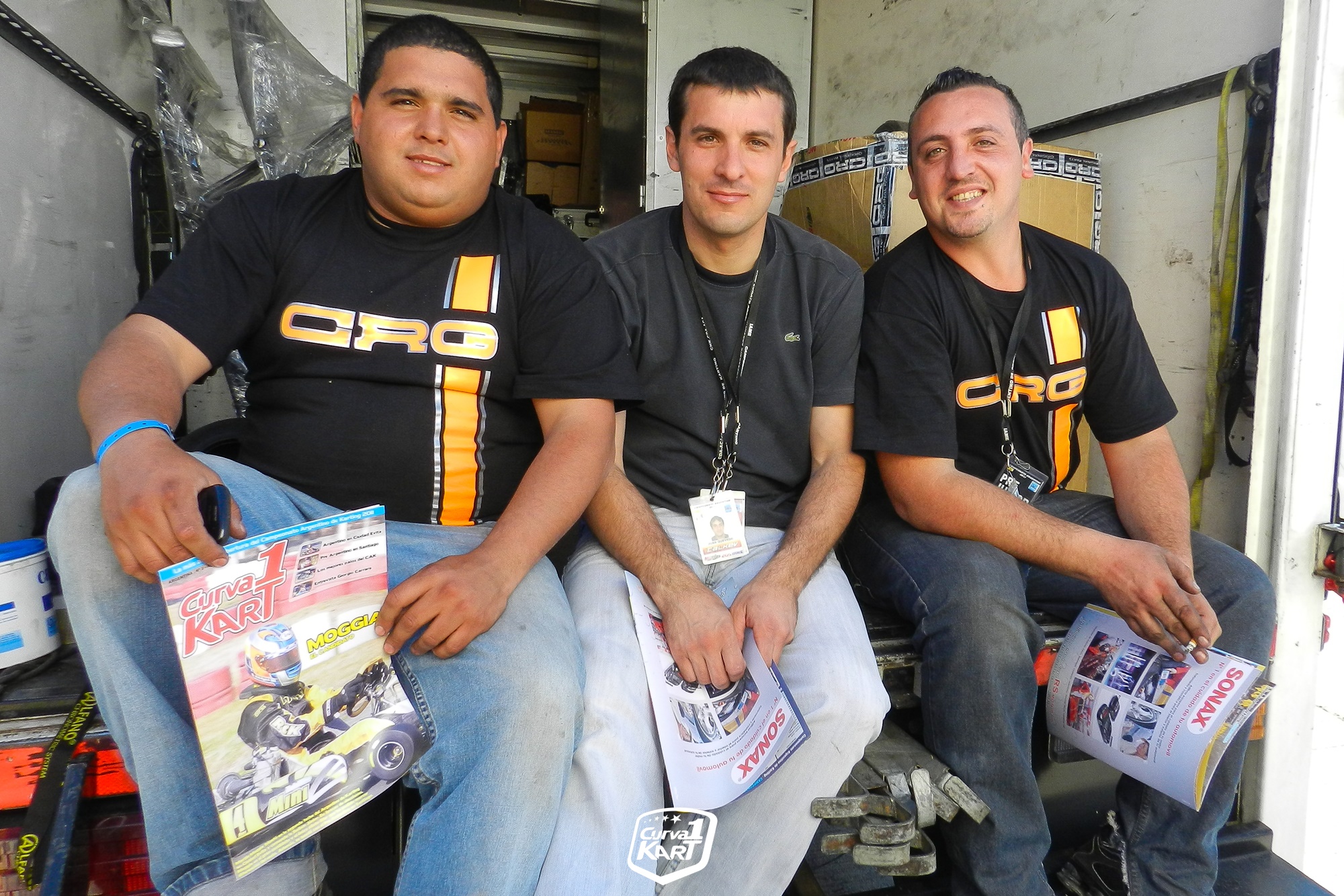 FOTO 2. Disfrutan de Revista Curva 1 KART en papel los mecánicos Cristian Arias (radicado en Miami) y Pablo Palermo de CRG. En el medio, Juan Manuel Quevedo, padre de Kevin que corría en Pre Junior.