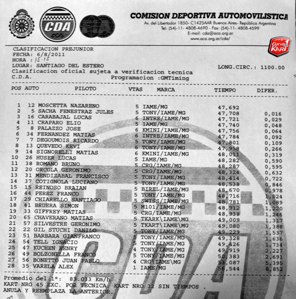 Clasificación de la Pre Junior donde el más rápido fue el mendocino Nazareno Moscetta (chasis Lenzo Kart), pero donde la pole fue para el cordobés Sacha Fenestraz del equipo Pancho Vicente, tras registrar el mejor tiempo en la “Súper Clasificación” (participaban los mejorez 10 de la clasifica, a una sola vuelta al circuito).