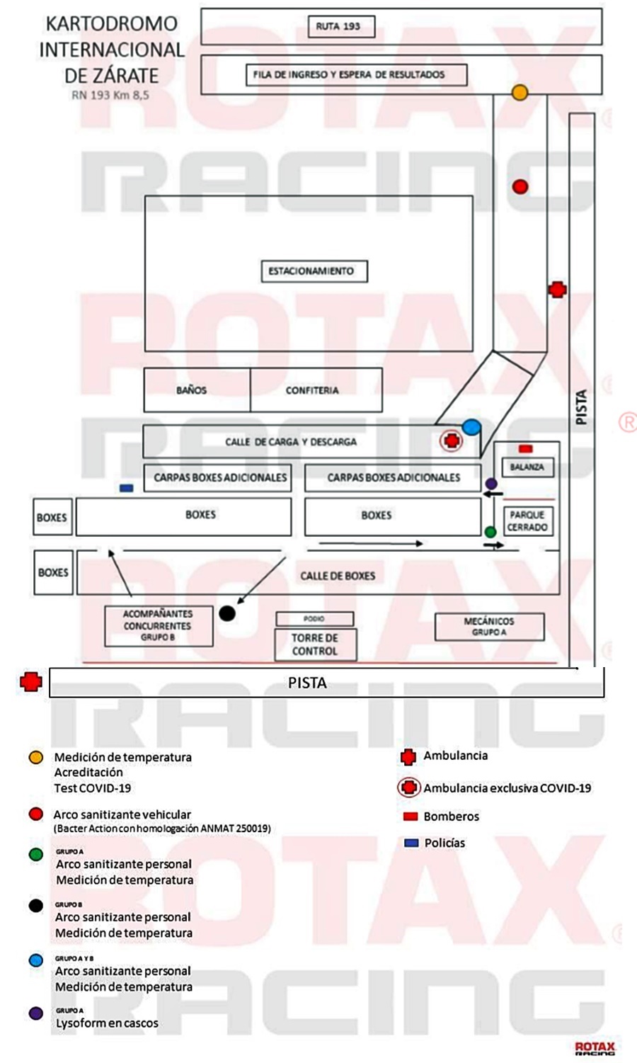 El Grupo (B) va a tener una circulación con un único sentido de ingreso al sector delimitado de la calle de boxes, para evitar que se cruce de manera frontal con otra persona. El ingreso será mediante un arco sanitizante (Producto Bacter Action con homologación ANMAT 250019) y se medirá la temperatura a cada persona.