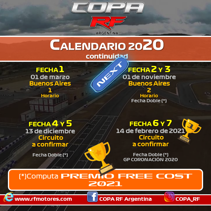 Tras el intento fallido de agregar una fecha en el mes de octubre, se ha decidido continuar con las fechas del calendario original, más el agregado de una fecha en febrero del 2021 que dará conclusión al actual certamen 2020.