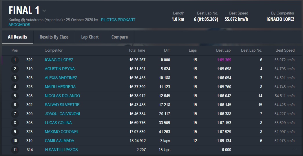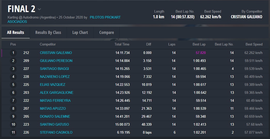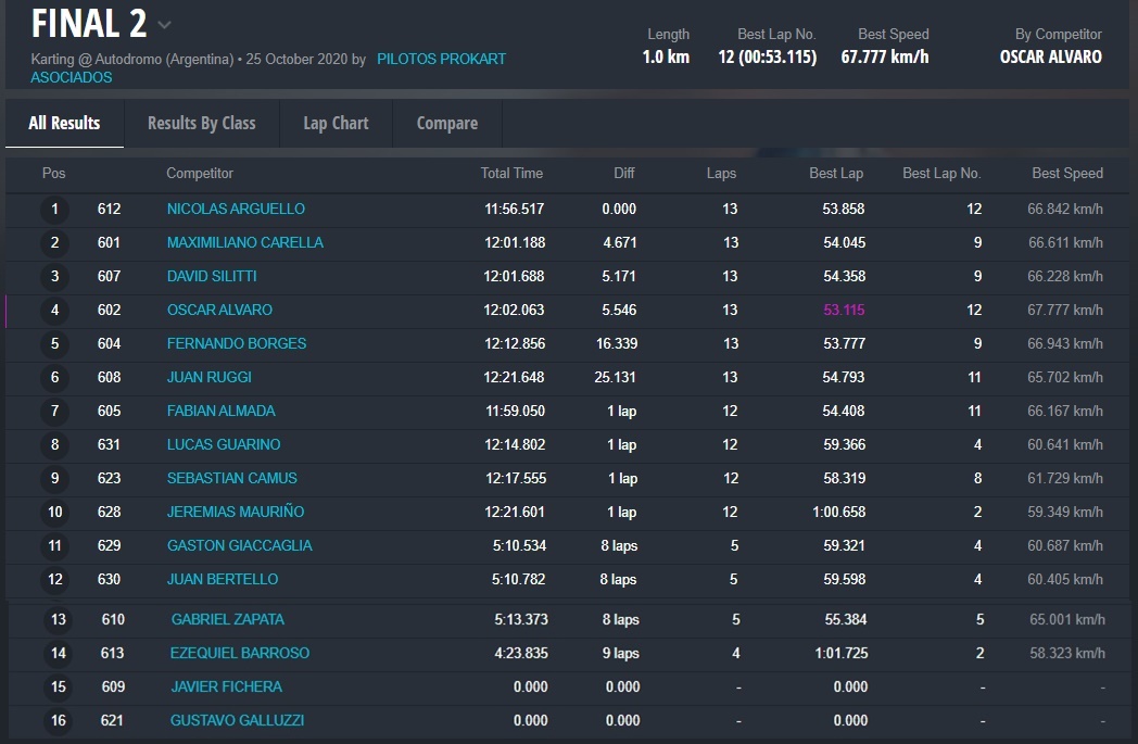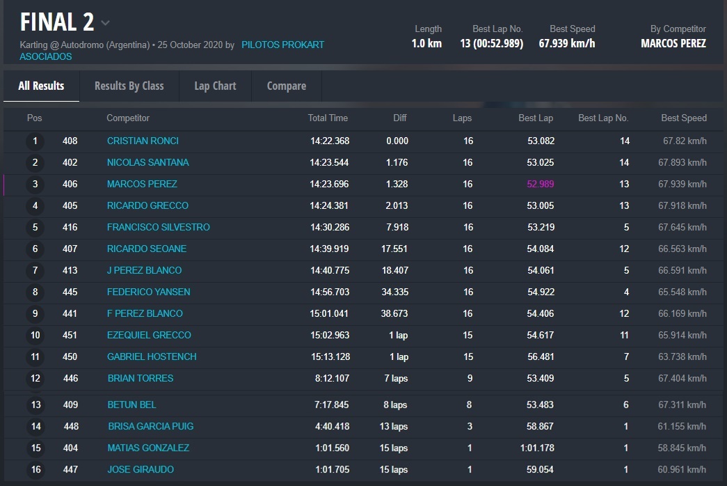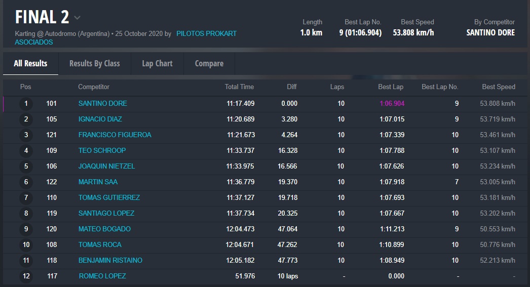 Los ganadores de las Finales 2 fueron: Santino Dore (Mini Promo), Christian Galeano (Junior 135cc), Ignacio López (General 135cc), Nicolás Argüello (General Mayores) y Cristian Ronci (Low Cost).