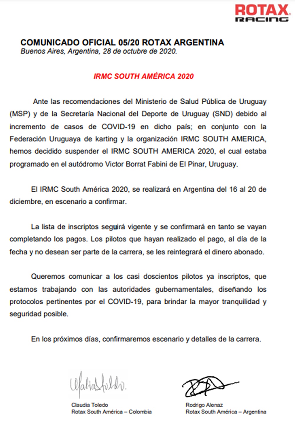 Ante las recomendaciones del Ministerio de Salud Pública de Uruguay (MSP) y de la Secretaría Nacional del Deporte de Uruguay (SND) debido al incremento de casos de COVID-19 en dicho país; en conjunto con la Federación Uruguaya de karting y la organización IRMC SOUTH AMERICA, hemos decidido suspender el IRMC SOUTH AMERICA 2020, el cual estaba programado en el autódromo Victor Borrat Fabini de El Pinar, Uruguay.
