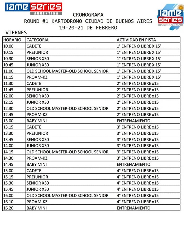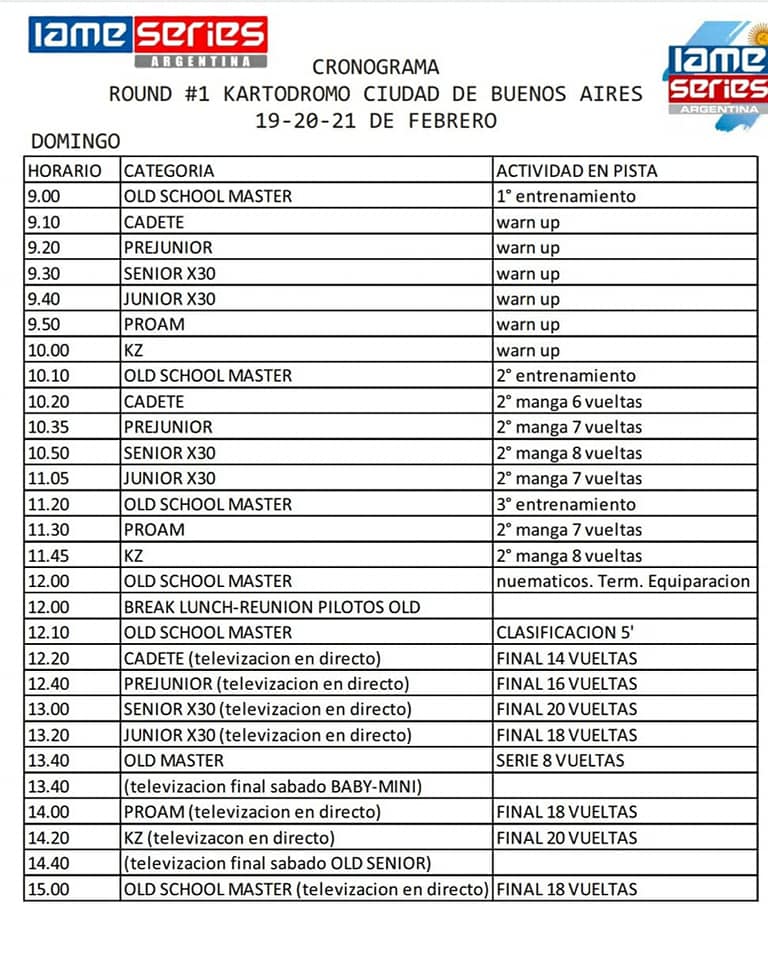 El cronograma anunciado arriba se aplica a las clases Cadete, Pre Junior, Junior X30, Senior X30, Proam y los KZ de la Copa Modena Engine Argentina.