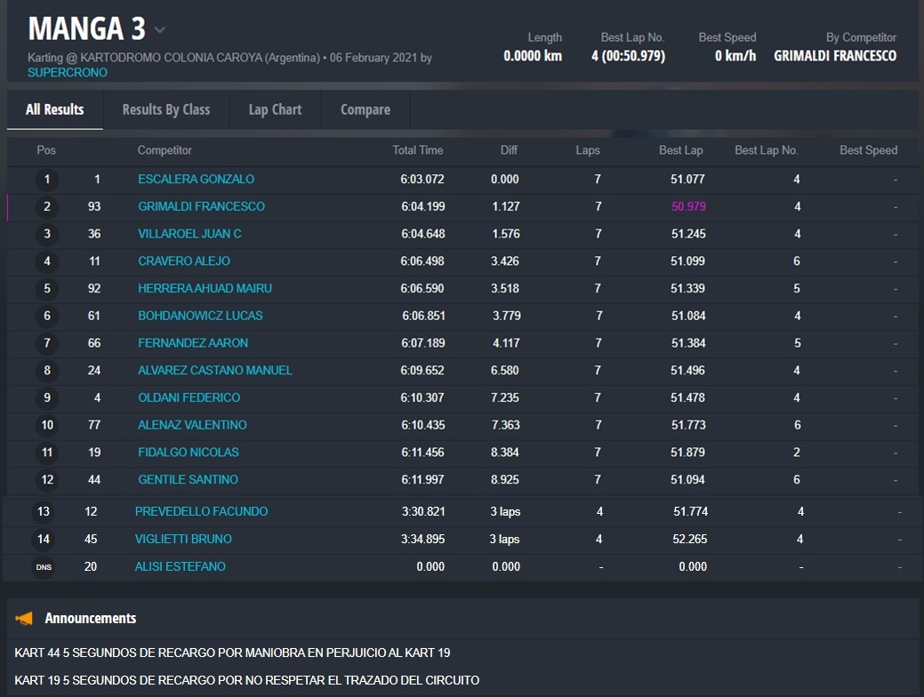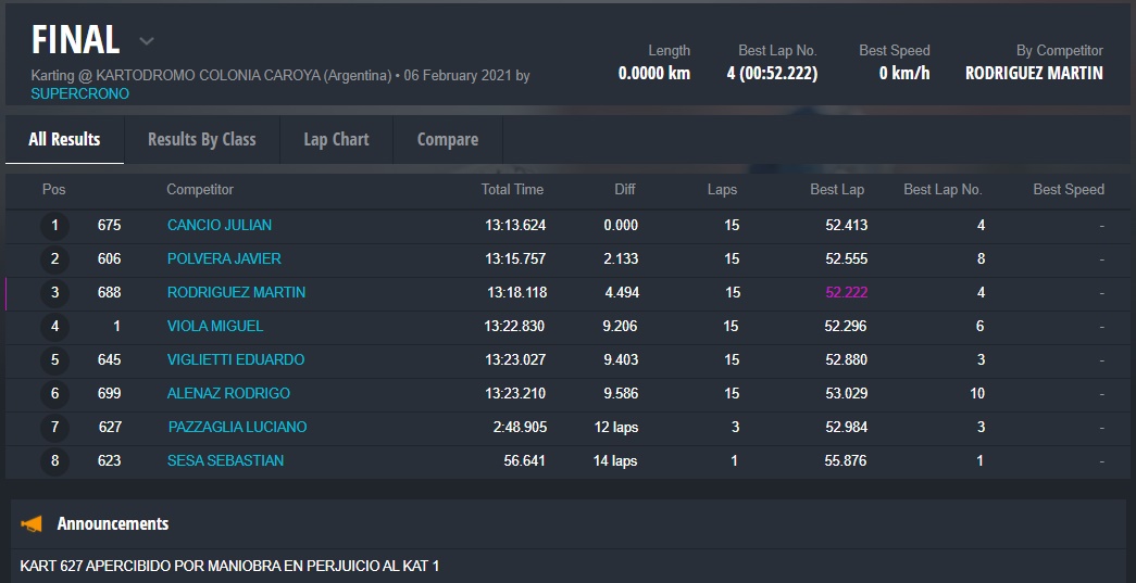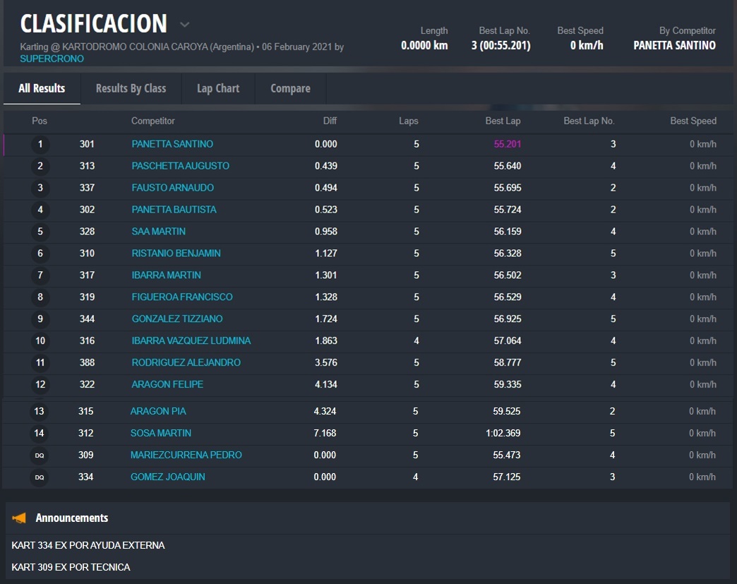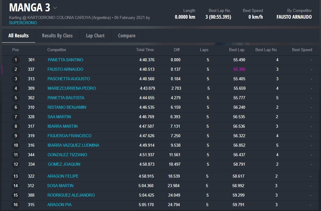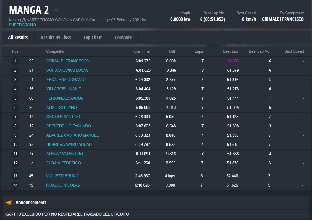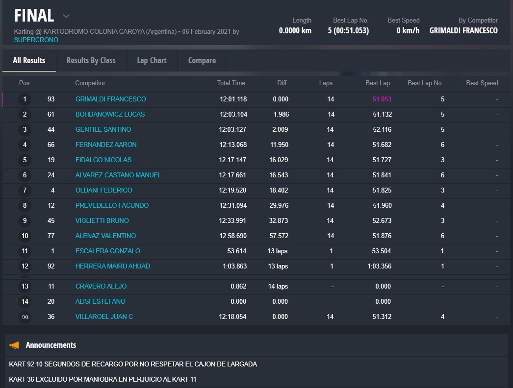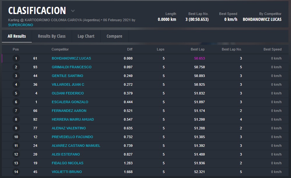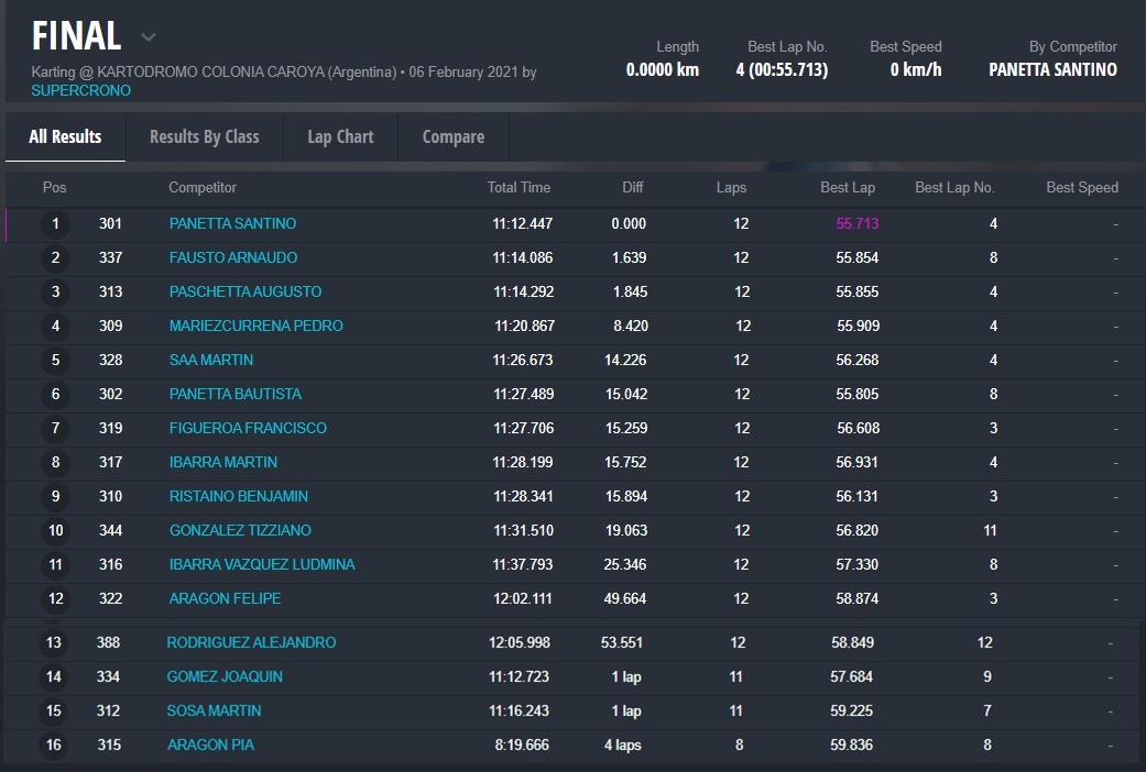 Hubo pilotos de 15 provincias y equipos de competición de distintas provincias, sumados a campeones argentinos, campeones sudamericanos, pilotos mundialiastas Rotax y más de una docena de debutantes. La carrera se denominó “Gran Premio Familia Vicente” y al término del acto protocolar Hugo y Pancho Vicente recibieron una plaqueta de más del organizador.