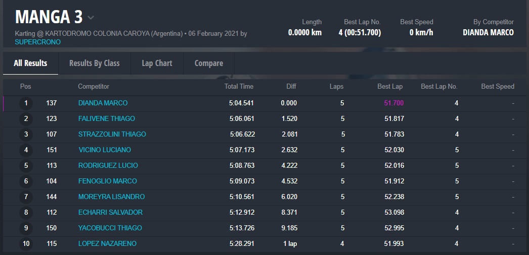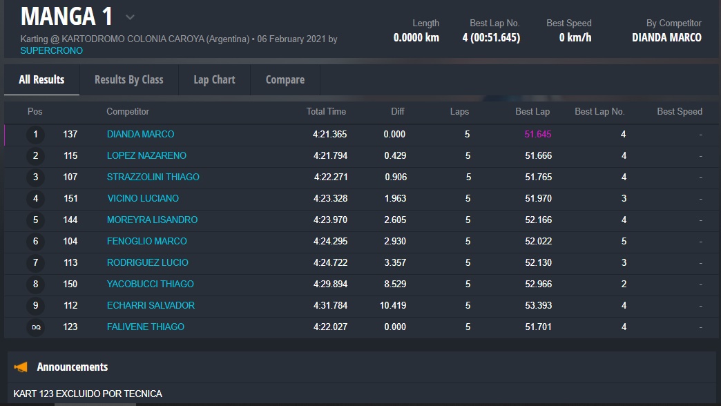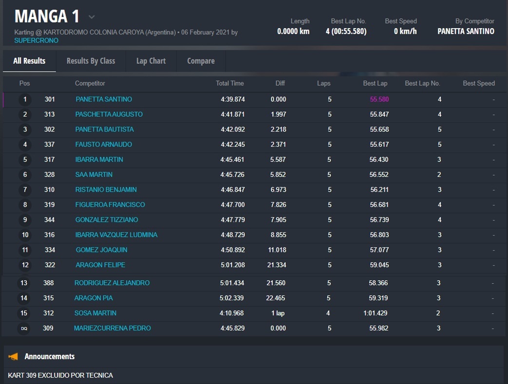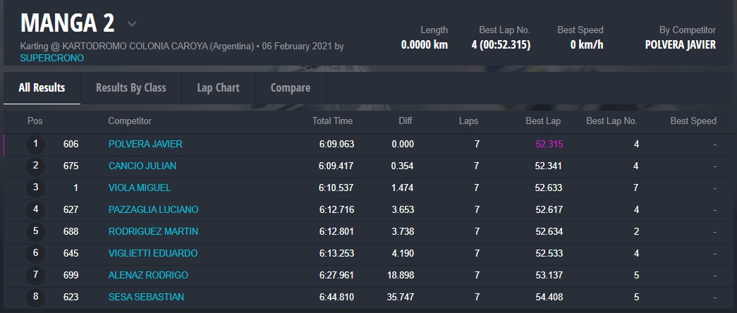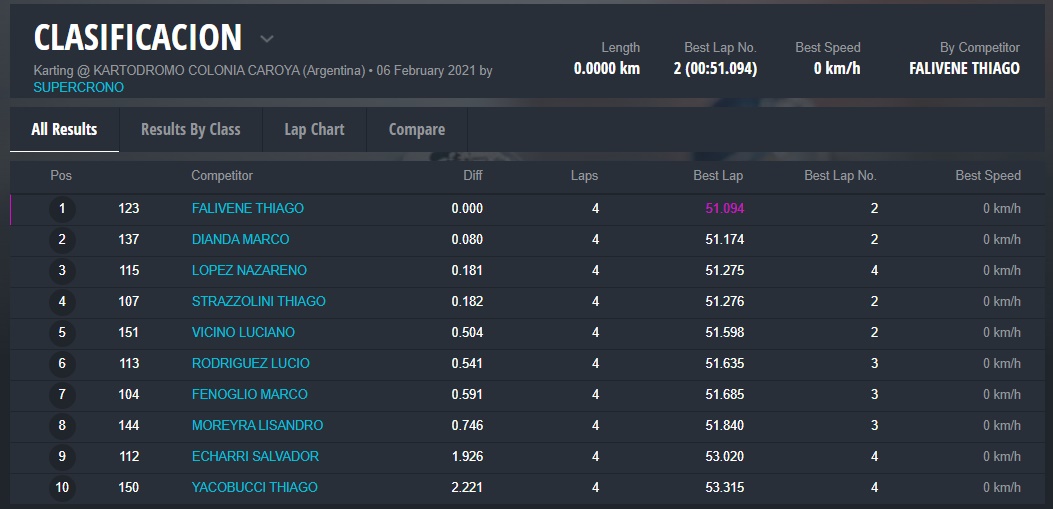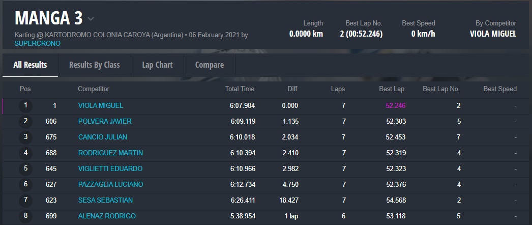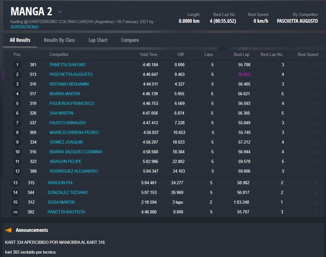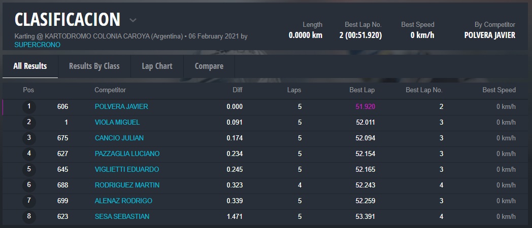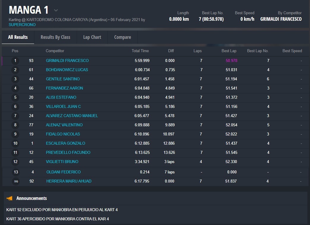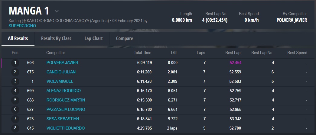 Hubo pilotos de 15 provincias y equipos de competición de distintas provincias, sumados a campeones argentinos, campeones sudamericanos, pilotos mundialiastas Rotax y más de una docena de debutantes. La carrera se denominó “Gran Premio Familia Vicente” y al término del acto protocolar Hugo y Pancho Vicente recibieron una plaqueta de más del organizador.