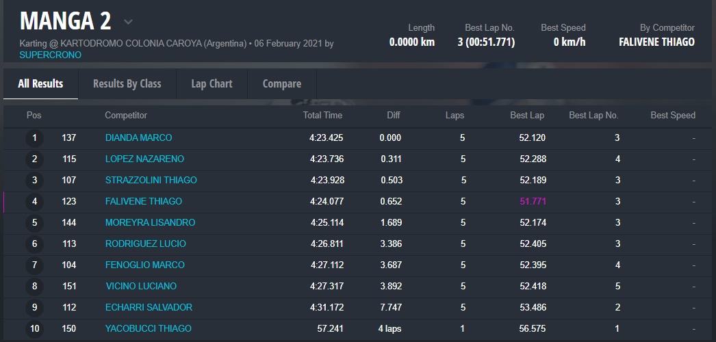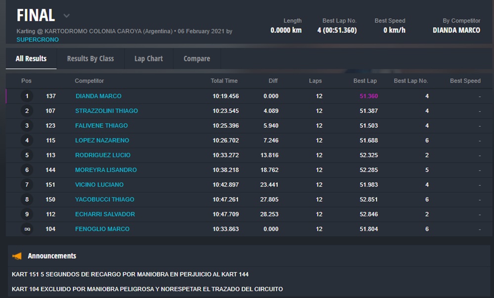 En Micro Max la victoria fue para Santino Panetta (Campana, Buenos Aires), mientras que en Junior Max festejó Marco Dianda (Guatimozín, Córdoba). La Senior Max se la llevó Francesco Grimaldi (Posadas, Misiones) y en Master Max ganó Julián Cancio (Buenos Aires).