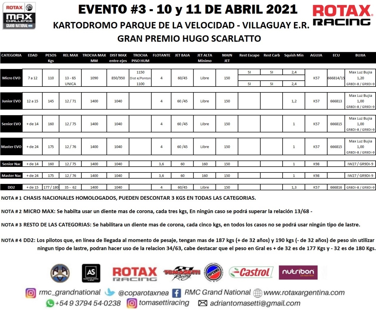 Cuadro técnico con pesos y relaciones habilitadas para competir en Villaguay.