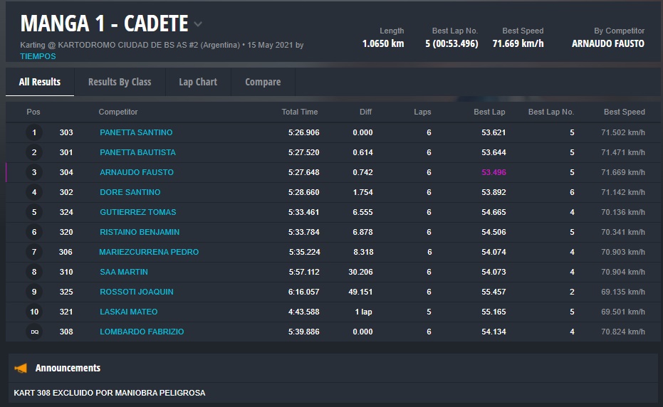 El domingo se completó la programación con victoria del cordobés Fausto Arnaudo (Zaffaroni Kart) que festejó por primera vez en CADETE, donde fue segundo Bautista Panetta y Santino Dore. Continúa como líder Bautista Panetta, ganador de las dos primeras fechas.