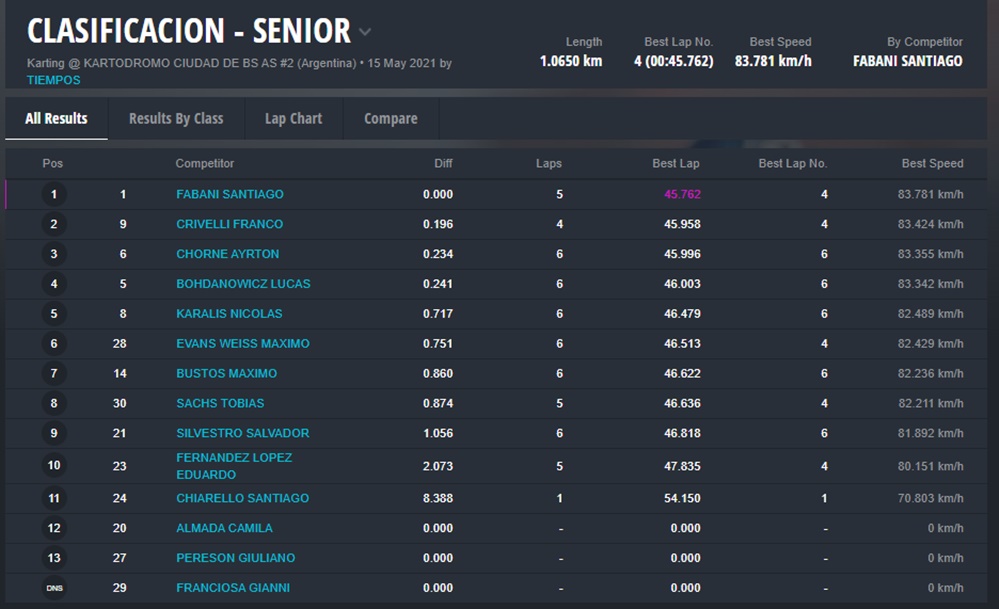 Córdoba sigue de moda y festejó también en SENIOR con el triunfo de Santiago Chiarello (Zaffaroni Kart) que llegó segundo en pista, pero heredó la victoria luego de la exclusión por técnica de Santiago Fabani. Segundo quedó en la planilla final el chaqueño Lucas Bohdanowicz, seguido por Franco Crivelli, en su regreso al karting nacional.