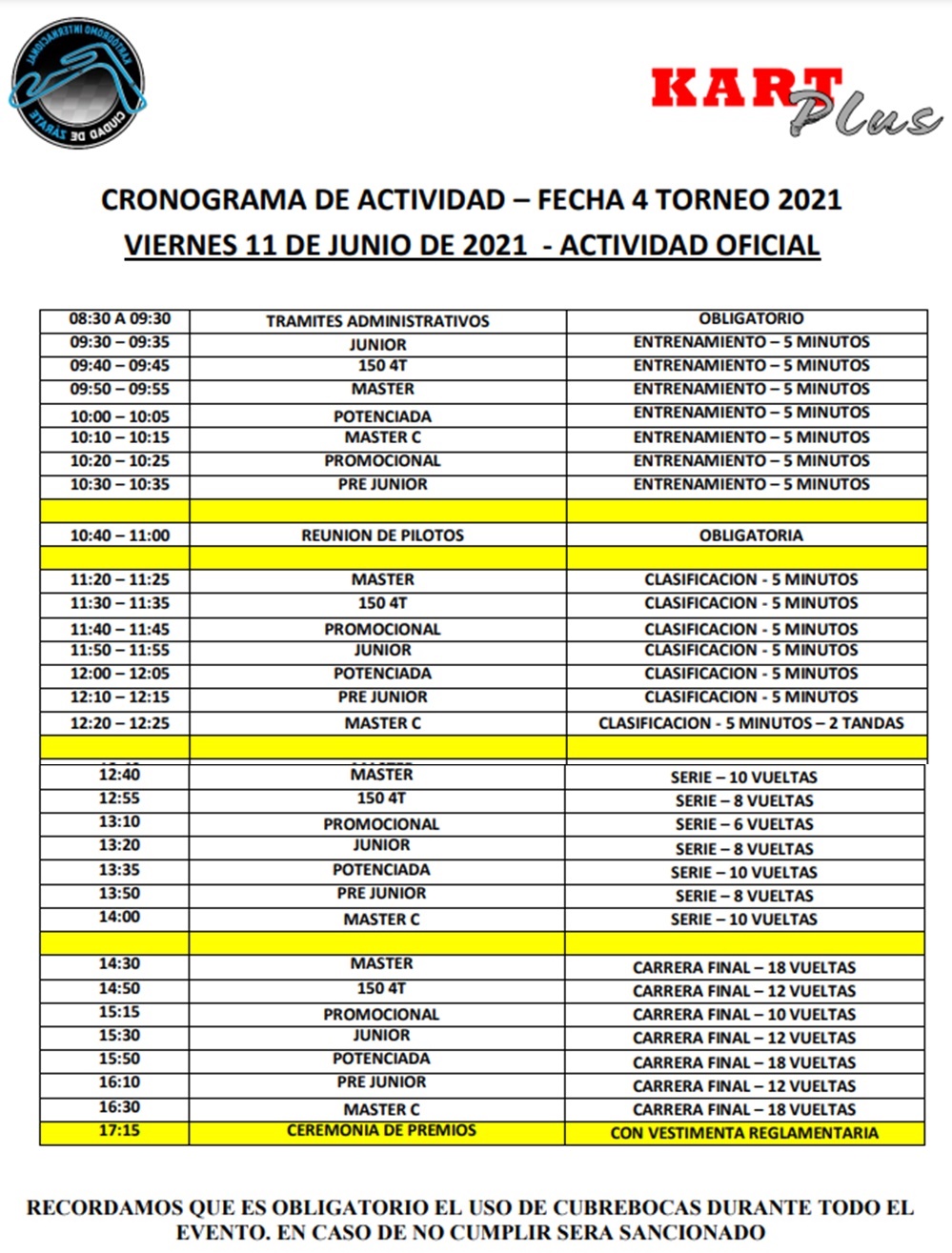 Debido a las medidas optadas por las autoridades nacionales, las cuales consisten en mantener restringida la circulación y los eventos públicos y deportivos durante los fines de semana, varias categorías, entre ellas nosotros, nos vemos obligados a realizar nuestro evento el día viernes 11 de este mes.
