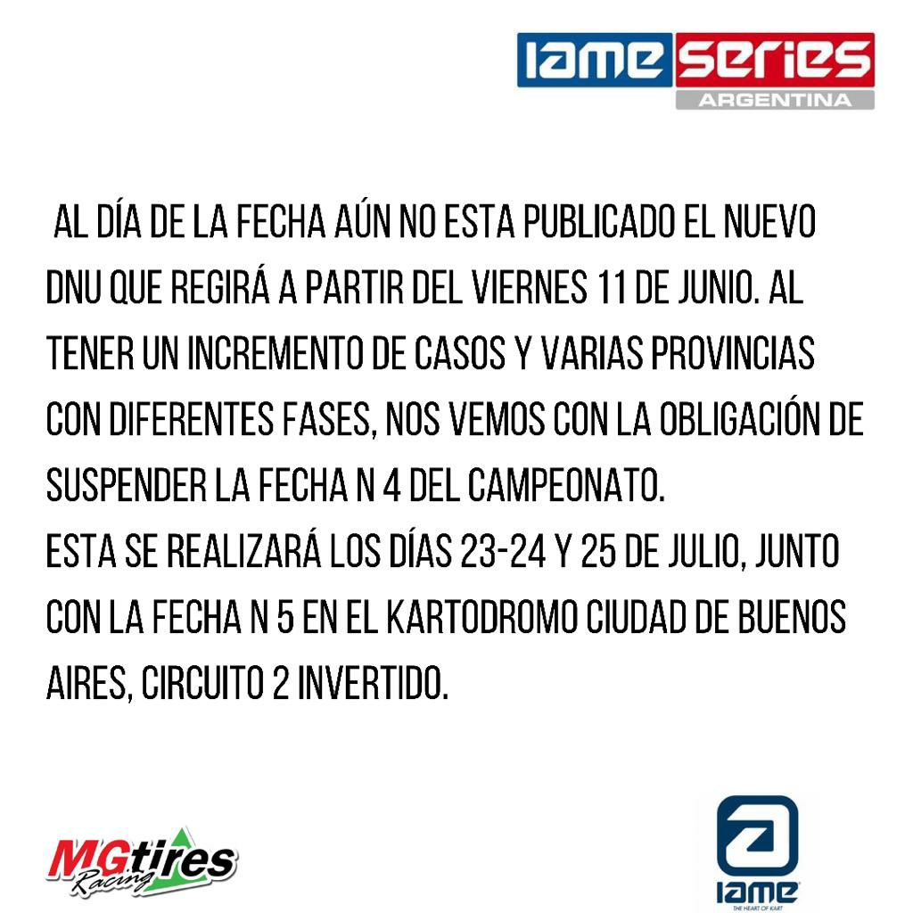 Finalmente y, ante tanta incertidumbre con las restricciones del Covid-19 en el país, la organización de IAME Series Argentina informó la suspensión de la fecha 4 que se iba a disputar este sábado 12 y domingo 13 de junio en Ciudad Evita.