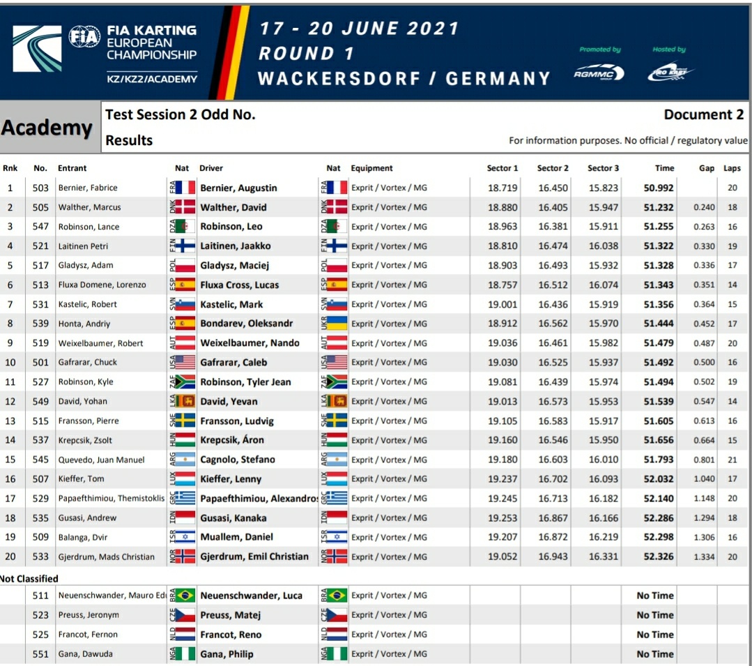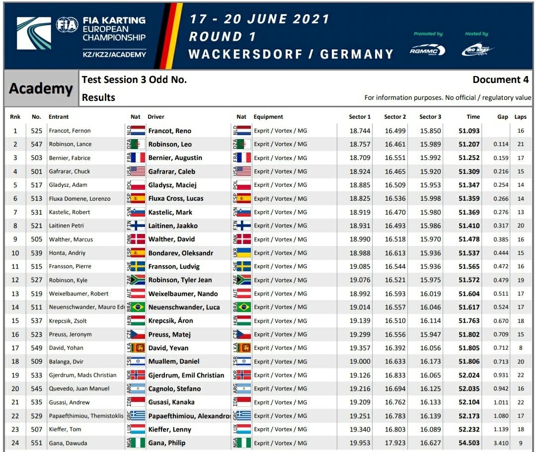 Stefano Cagnolo completó hoy jueves las primeras prácticas cronometradas de la fecha 1 del torneo “FIA Karting Academy Trophy” que se está llevando a cabo en Wackersdorf, Alemania.