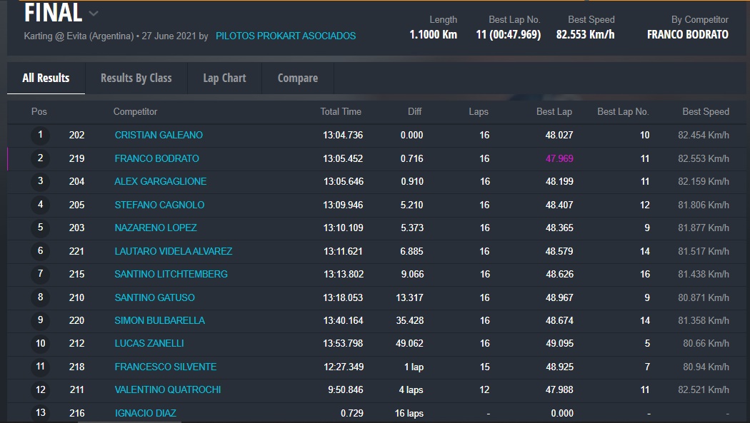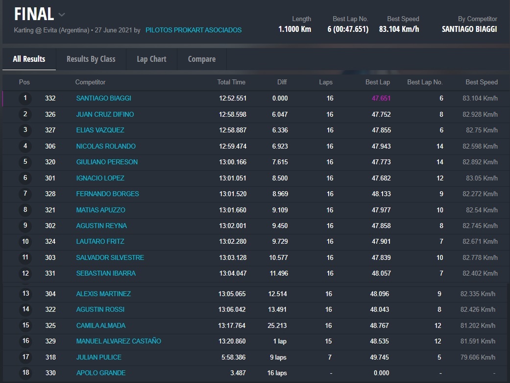 Carrerón se mandó Juan Cruz Difino, que partió desde la décimo cuarta posición y recibió la bandera en la segunda posición. Completó el podio Elian Vázquez, seguido de Nicolás Rolando y el santafesino Giuliano Pereson (Al Kart).