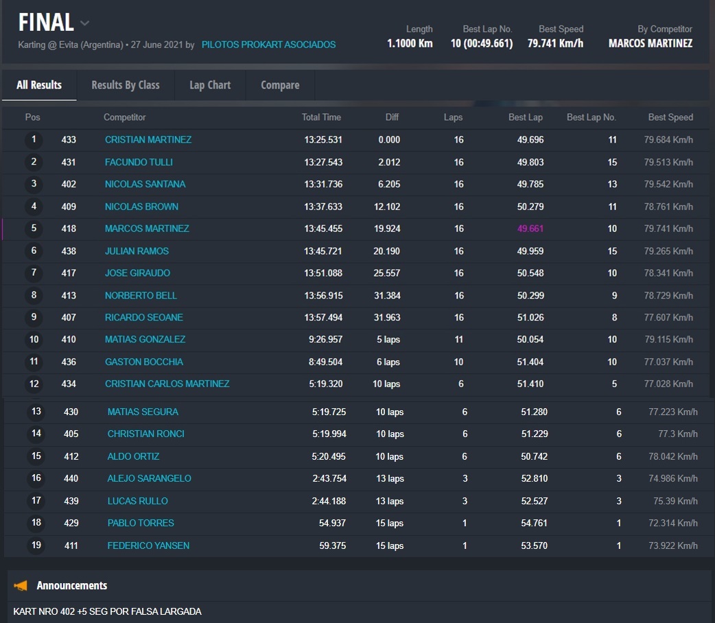 Tulli, Martínez y Nicolás Santana lucharon por la victoria, en una carrera pareja y con varios sobrepasos. Lideró Santana por un momento, pero Cristian Martínez consiguió ganar en la vuelta de Prokart a las pistas.
