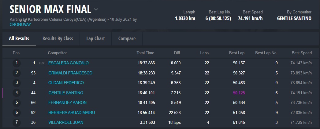La categoría más federal del país vio dos triunfos en Senior Max. El misionero FRANCESCO GRIMALDI se quedó con la qualy, pre final y final de la cuarta fecha disputada el sábado, mientras que el domingo la clasificación del quinto round fue para el puntano Aaron Fernández, Grimaldi ganó la pre final y el tucumano GONZALO ESCALERA se impuso en la carrera que cerró el evento.